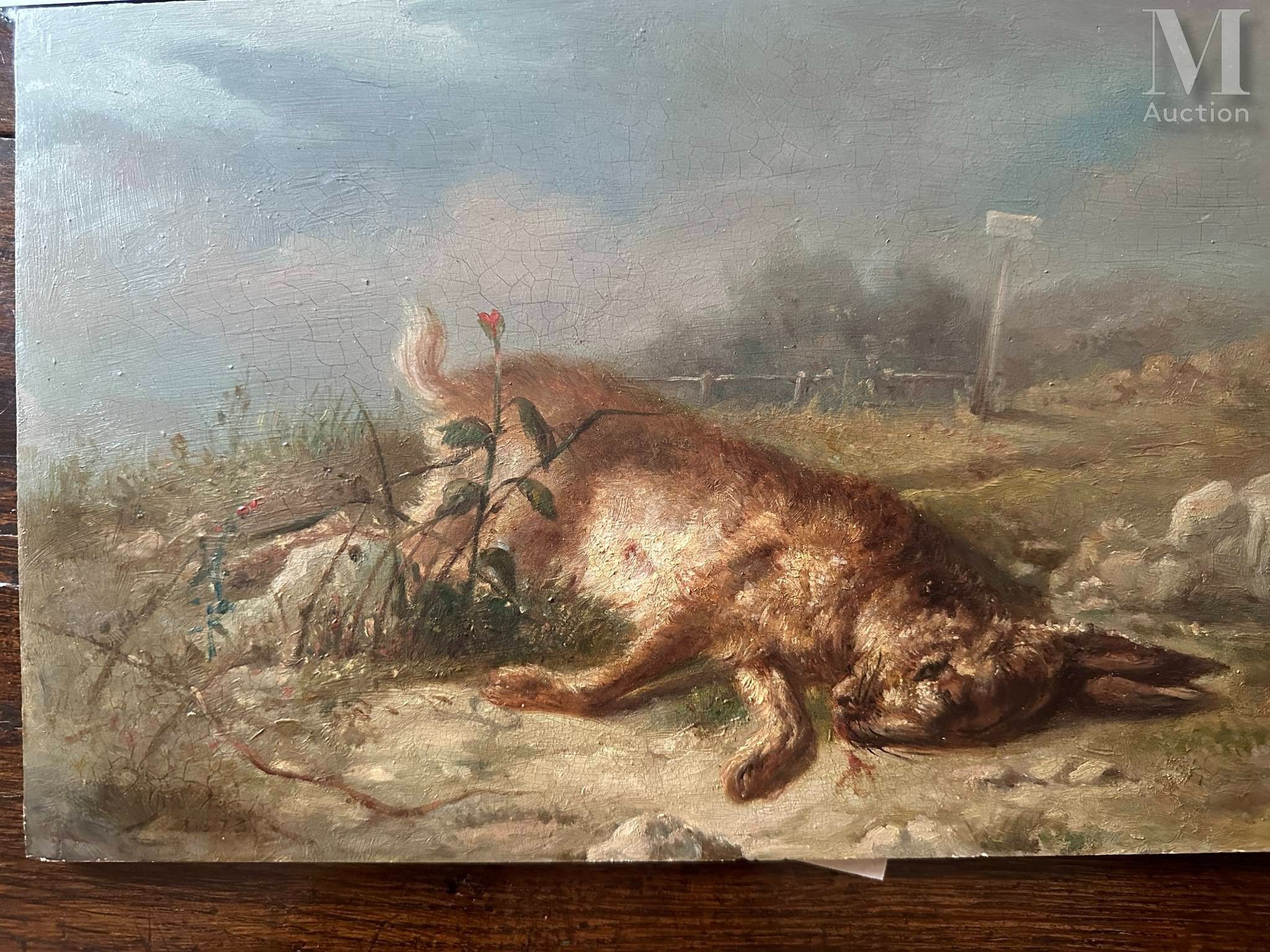 Ecole française fin du XIXème siècle Nature morte au lièvre Huile sur panneau Signé en bas à gauche F. A. YEN ? et daté 1873 22 x 34 cm