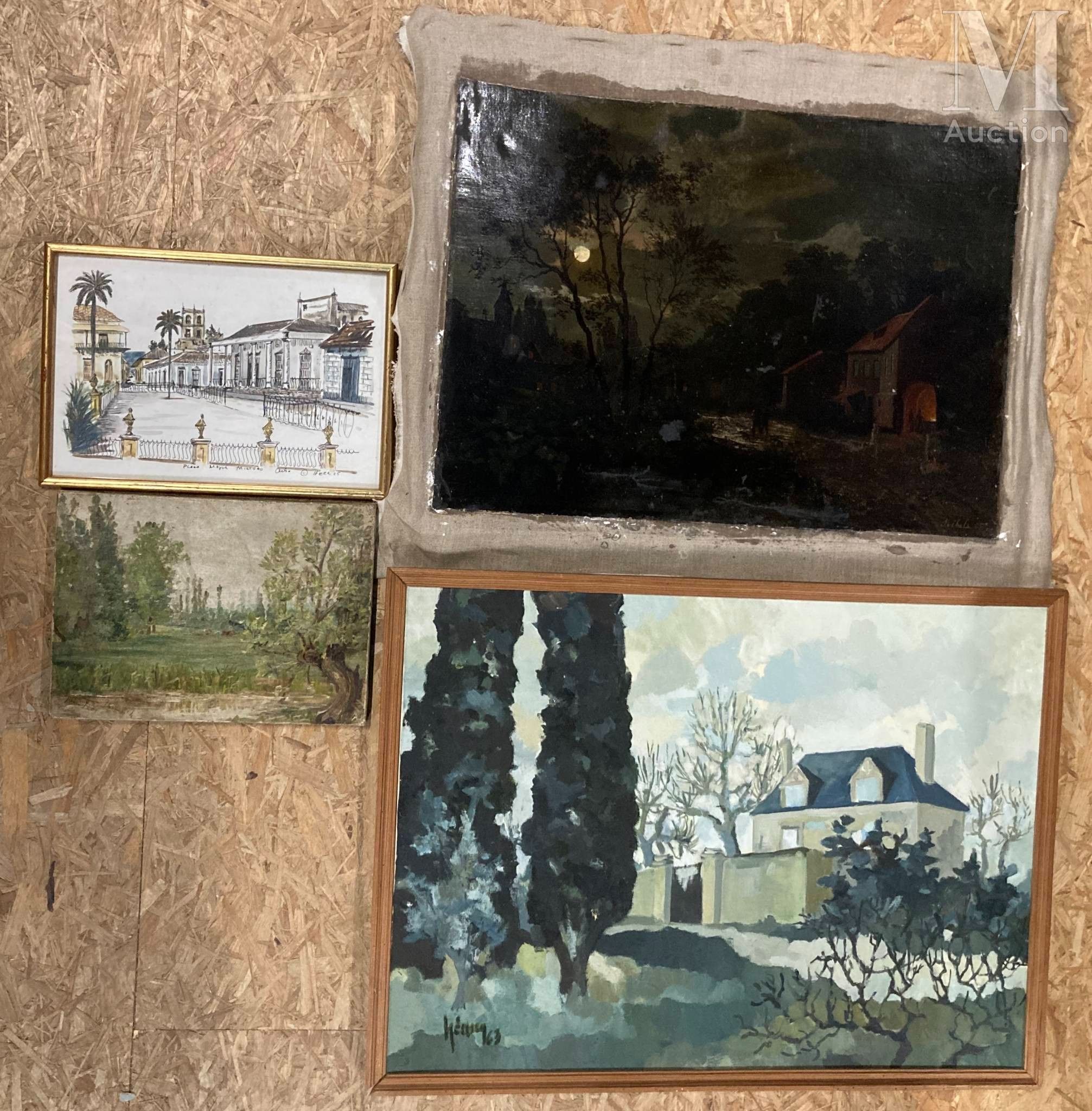 Lot de tableaux - Une toile sans châssis représentant un paysage de nuit - HEROIS (XXe), plaza Mayor - Ecole FRANCAISE XXe, toile, maison, signé - Ecole FRANCAISE XXe, toile, paysage, signé 46 X 64 cm (Nuit) (En l'état)