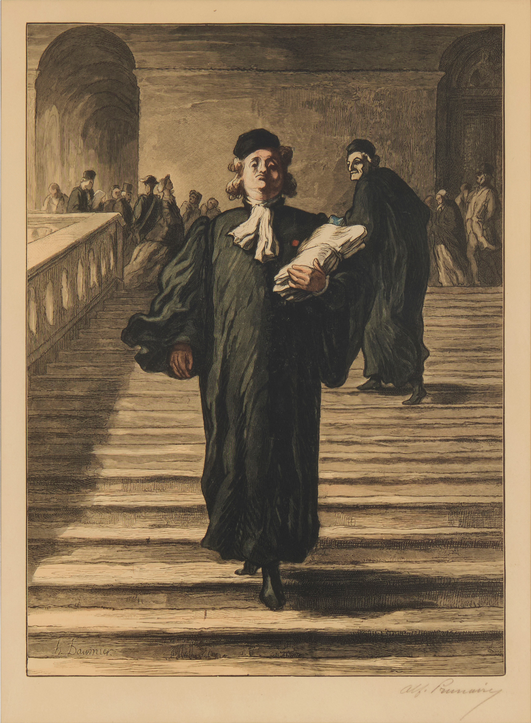 After Honoré Daumier (1808-1879) "The Grand Staircase of the Palais de Justice," circa 1864 Woodcut in colors on paper From the edition of unknown size and date Signed in the block, lower left: h. Daumier; Alfred Prunaire, prntr., and their pencil signature ("Alf Prunaire") in the lower margin, at right; titled on a gallery label affixed to the frame's backing paper Image: 13.875" H x 10.25" W; Sight: 15.5" H x 11.375" W Provenance: Galerie DeVean, Beverly Hills, CA Overall good appearance. With margins. Pale light-staining. The surface of the upper margin edge is slightly uneven, presumably attendant to how it's framed. Not examined out of the frame. Framed under glass: 26" H x 18.625" W x 1" D