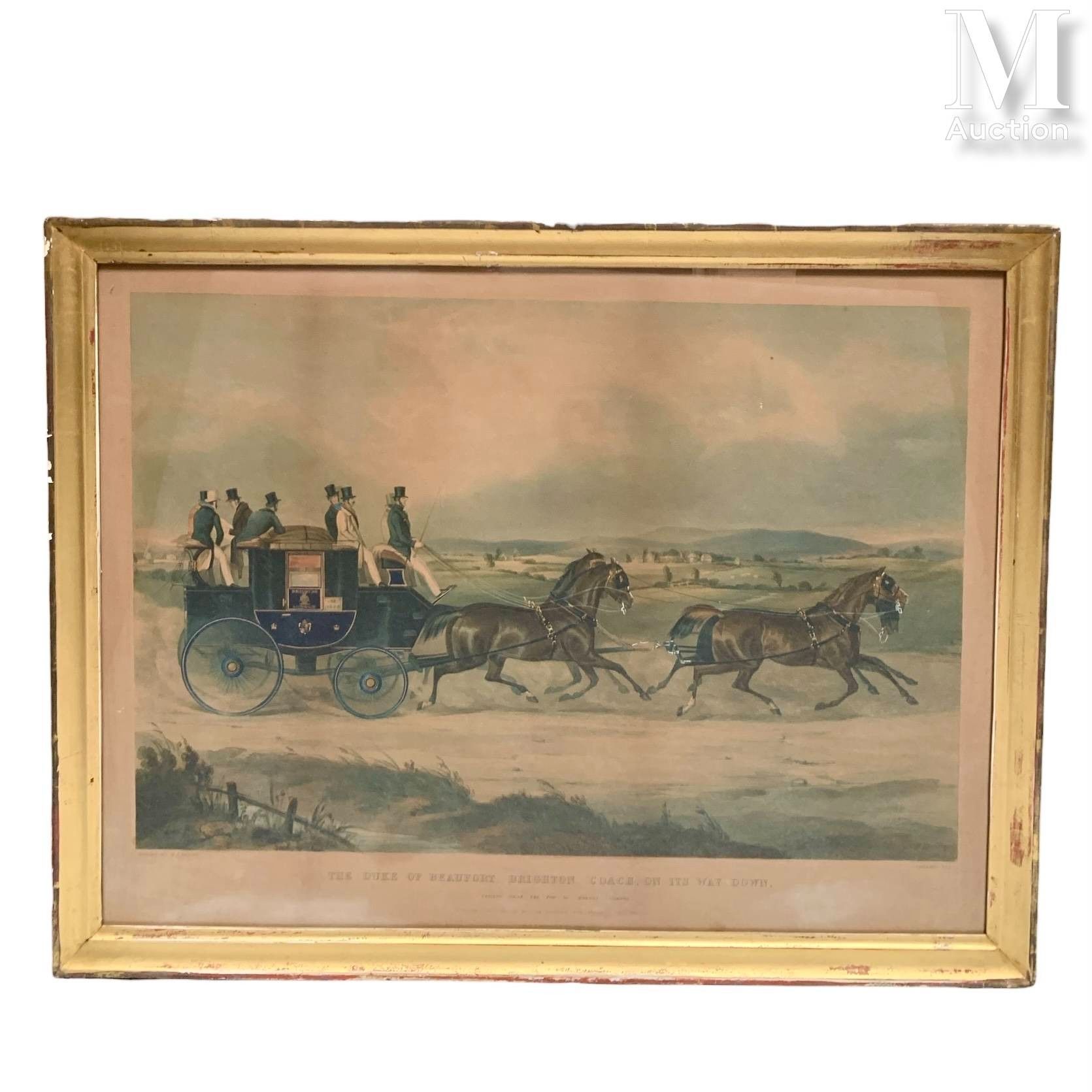 • Lot n° 131 D’après W J SHAYER par FAIRLAND The Duc of Beaufort Brighton Coach, on its way down Gravure en couleur, signée dans la planche 46 x 26 cm à vue On y joint : Brégeaut imprieur Ecole du XIXème siècle Gravure en couleur sur papier 9 x 11 cm à vue Ecole francaise de la fin XIXème siècle Militaires Français et leur Hotesse Gravure réhaussée sur papier, Titrée en bas au centre Diam : 7 cm