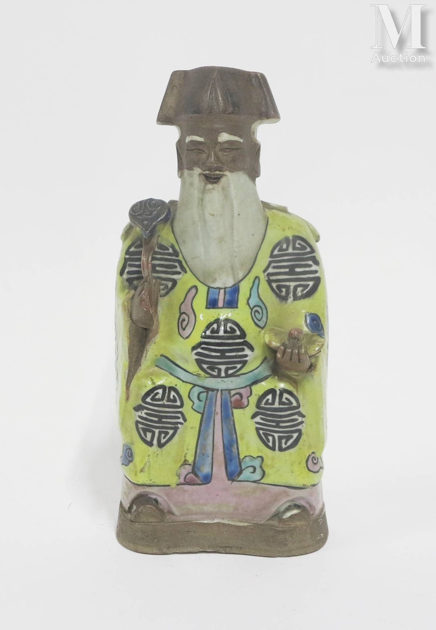 CHINE, Epoque Jiaqing, XVIIIe-XIXe siècle Figurine en porcelaine à décor en émaux de la famille rose, représentant Shoulao assis sur un trône, tenant un scèptre ruyi. Hauteur : 20,5 cm (manque les doigts d'une main)
