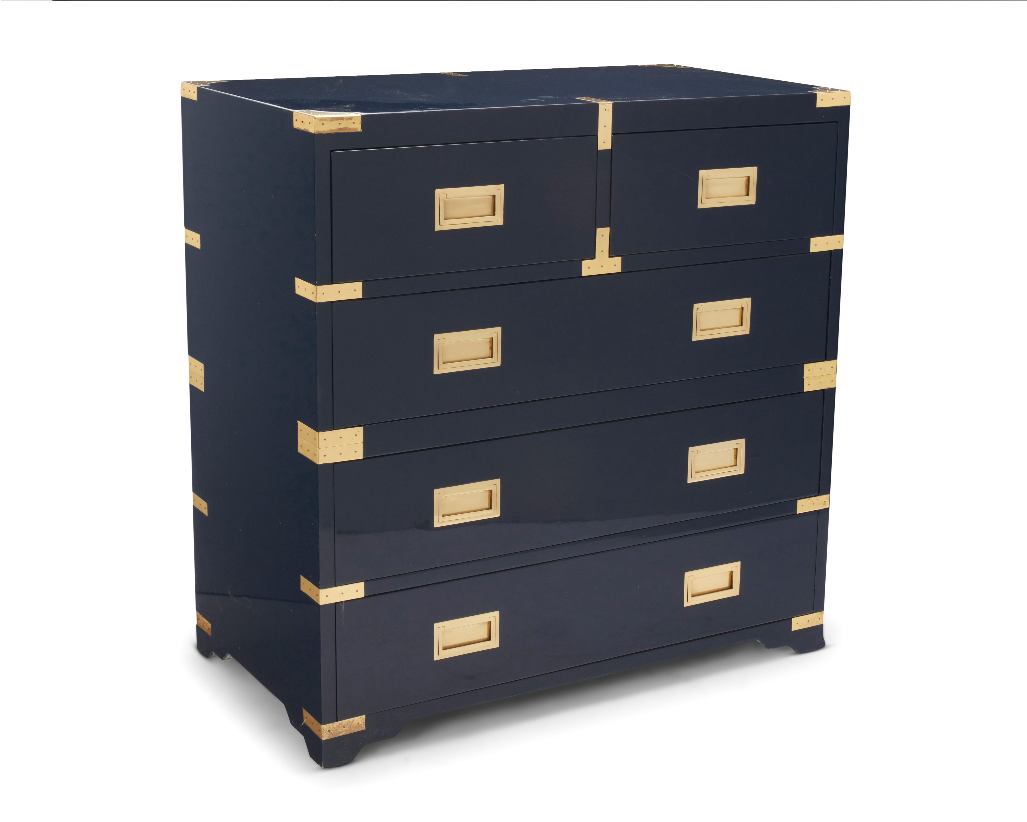 A David Ross 'Chiba' campaign chest Circa 2020s With metal manufacturer's tag to top drawer interior The five-drawer lacquered wood chest with polished brass hardware and pulls, raised on bracket feet 40.25" H x 39.5" W x 21.75" D Overall good condition with scattered scuffs, scratches, nicks, and small abrasions commensurate with age. Oxidation to brass hardware. One bracket foot with a 1.5" x 1.5" area of loose wood from an abrasion.
