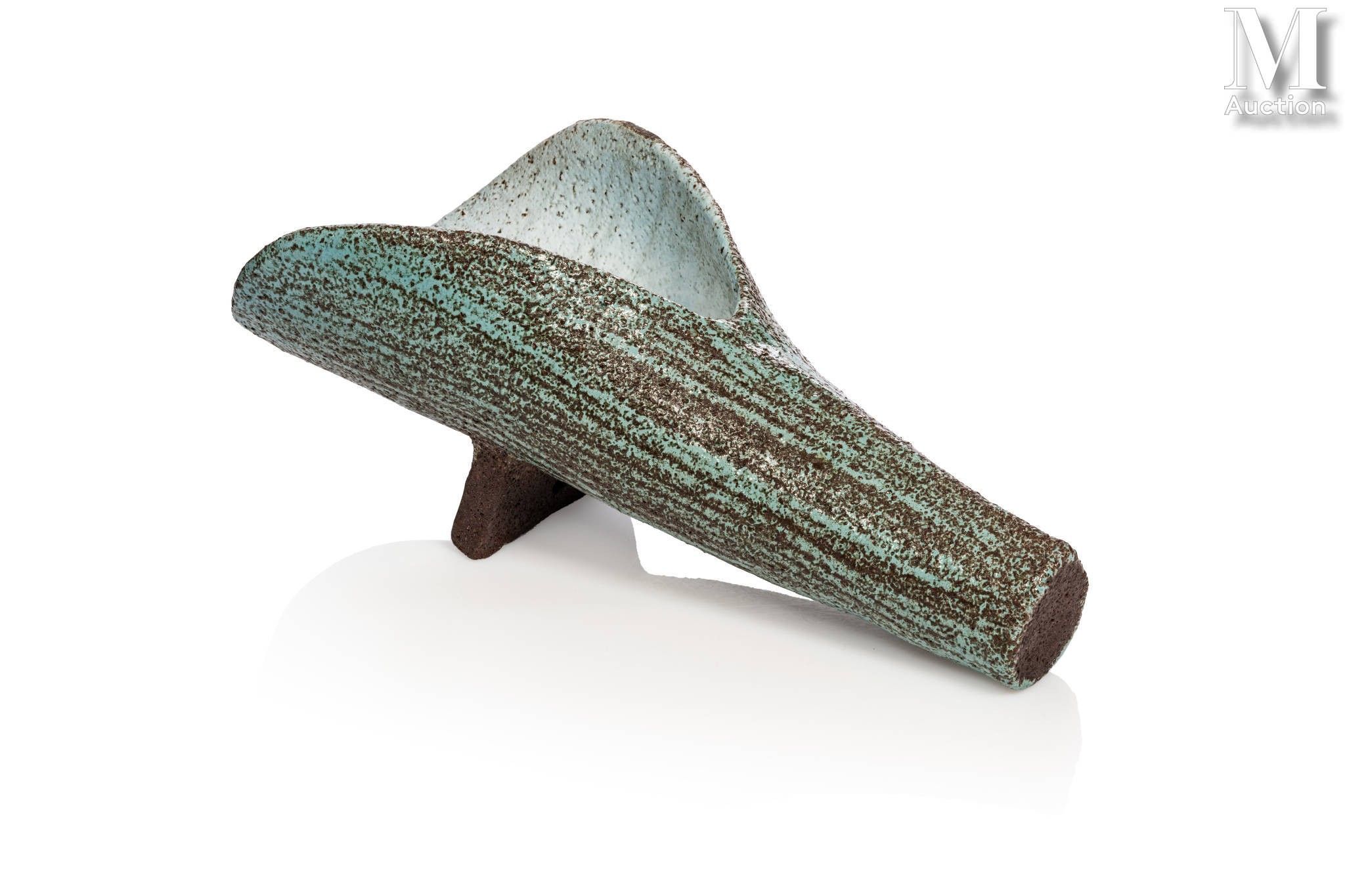 • Lot n° 201 Poterie d'ACCOLAY Bouquetière en faïence émaillée verte à nuance brune. Signée au dos . 36 x 17 x 13 cm (légers fêles)