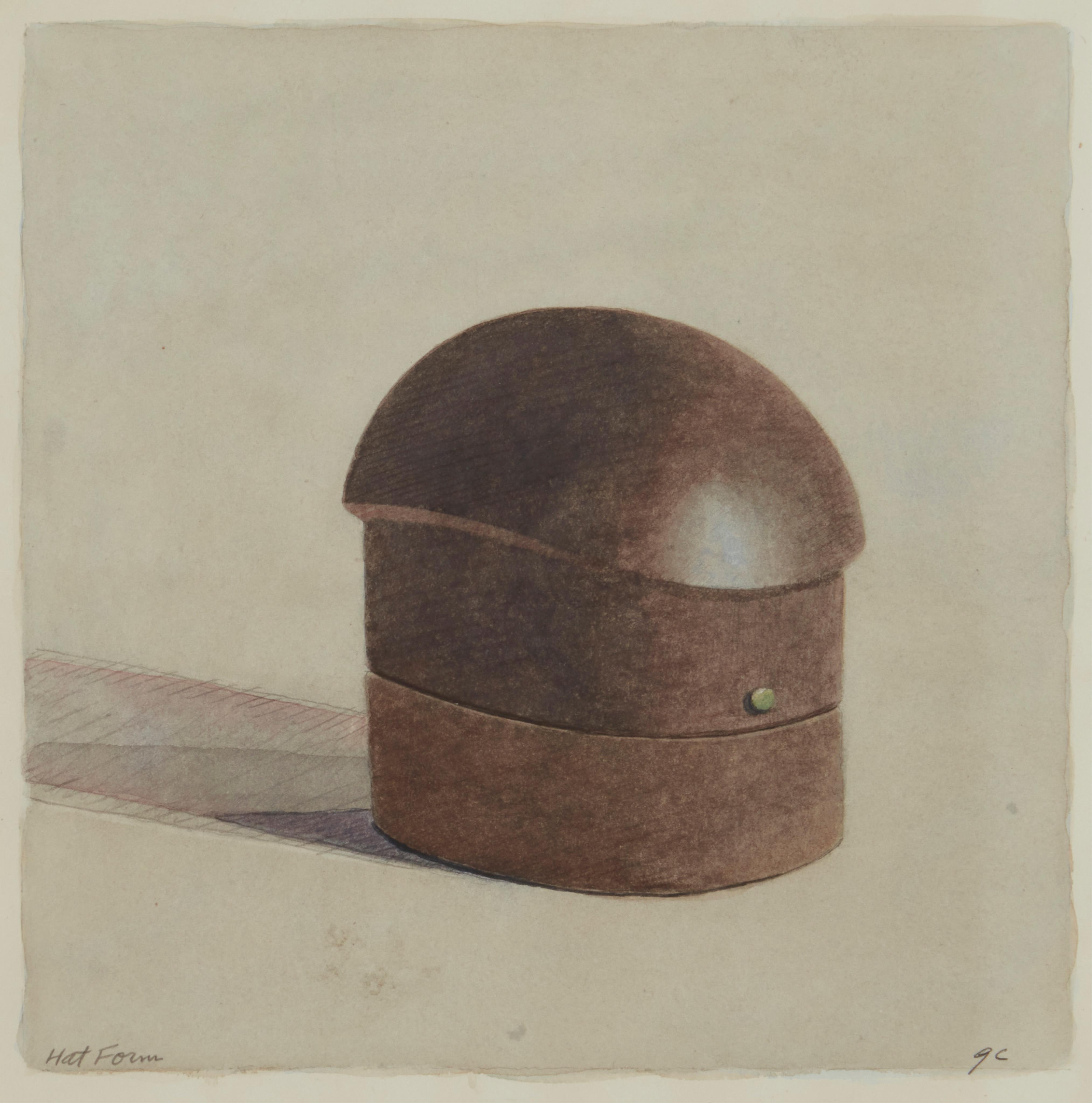 Gordon Cook (1927-1985) "Hat Form," 1979 Watercolor on paper Initialed and titled in pencil along the lower edge: GC; titled twice, dated "1979," and numbered "#273" on labels affixed to the frame's backing paper Image: 10" H x 10" W; Sight: 10.75" H x 10.75" W Provenance: Charles Campbell Gallery, San Francisco, CA Other notes: An active painter, printmaker and educator in the Bay Area art scene, Gordon Cook was born in Chicago and attended Illinois Wesleyan University, earning a B.F.A. in 1950. He continued his studies at The American Academy of Art in Chicago and took graduate courses under intaglio printmaker Mauricio Lasansky at the State University of Iowa. At the beginning of his career, Cook focused on printmaking. Moving to the painted medium, early works featured still-life subjects of singular objects such as a flower, wheel or box like the present work. While small in size and in muted colors, these works were defined by expressive impasto paint application. After the 1970s and his marriage to artist Joan Brown, Cook began to paint the landscape, particularly solitary buildings in the delta area of the Sacramento River. His work also included floral still life, nudes, portraits and cityscapes.