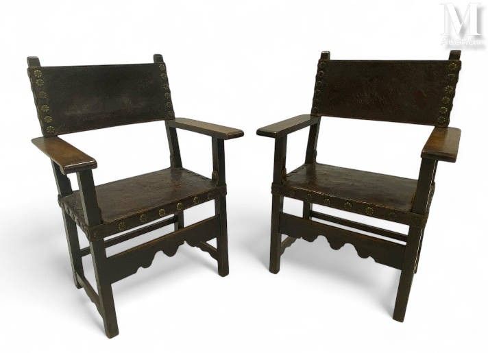Dans le style du XVIIème siècle Paire de fauteuils à bras, bois et garniture de cuir clouté. 100 x 71 x 49 cm. Accidents et manque