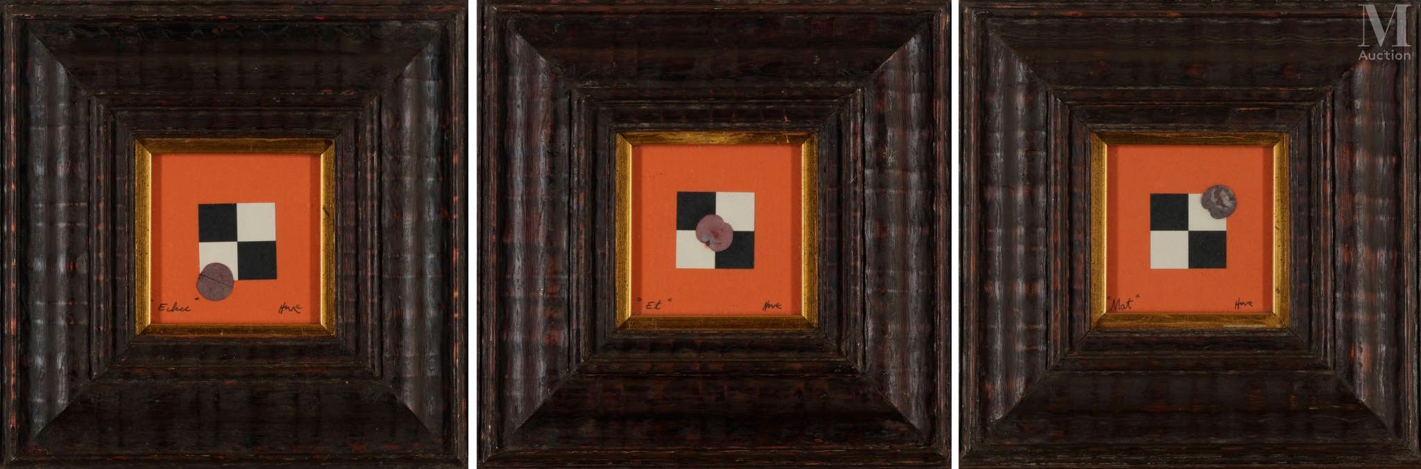 • Lot n° 258 Alexis De KERMOAL (Singapour 1958 - Vésinet 2002) Triptyque mathématique Technique mixte sur carton signée au centre. 20 x 53 cm.
