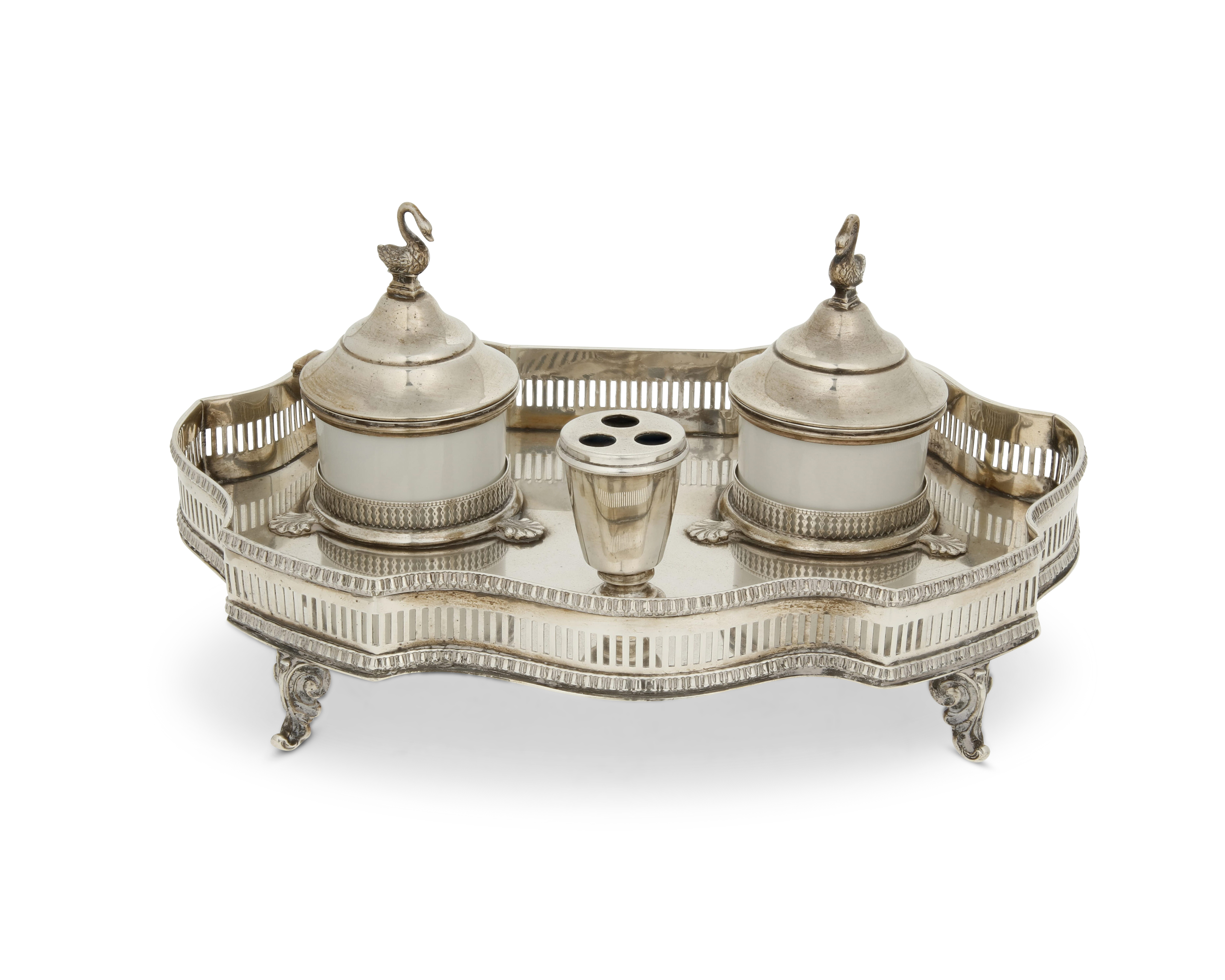 An Italian .800 silver inkstand Mid/late 20th century Stand with Italian marks for .800 and Milan; each well marked in green: Limoges / France The two porcelain wells with silver hinged lid and swan-form finial, set in a stand with pierced gallery and raised on scrolled feet Overall: 4.25" H x 9.75" W x 7.125" D 26.9 gross oz. troy approximately Overall good condition with tarnishing, soiling, and light scratches commensurate with age. Weight includes non-silver components.