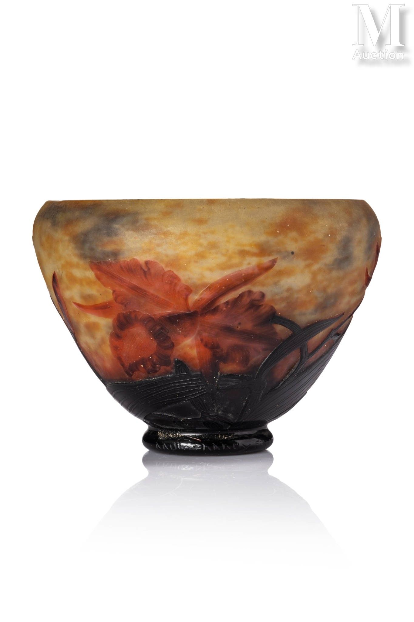• Lot n° 189 DAUM - Nancy "Cattleyas" Décor créé en 1913 par Henri Berger Coupe en verre multicouche à petit talon rond en retrait et décor dégagé en fine réserve brillante et entièrement repris à la roue de fleurs et de feuilles de couleurs rouge-orangé et brun-noir sur un fond martelé à fines facettes et jaspé de poudres intercalaires jaune-orangée, rouge-violine et blanc-rosé. Signée "Daum-Nancy France" en pourtour du pied. H. : 11,5 cm, D : 17 cm (fêle interne) A "Cattleyas" (decor created in 1913 by Henri Berger) multilayer glass cup from Daum – Nancy, with an etched an fully wheel taken off decor oforange-red and brown-black flowers and leaves on an hammered background showing yellow-orange, red-purple and pinky-white interlayer powders. Signed "Daum-Nancy France" around the foot. H. : 4,53 inch, D : 6,69 inch (inside crack)