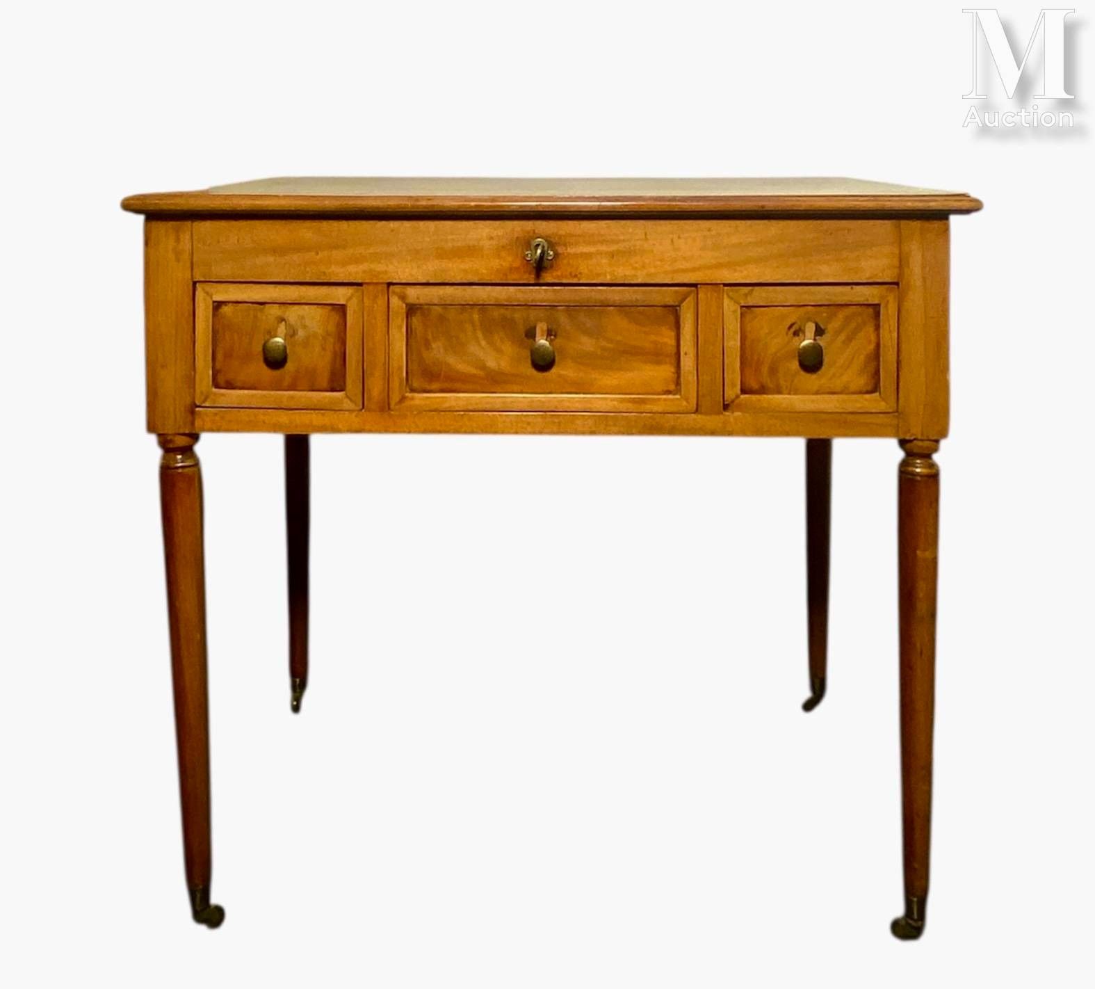 • Lot n° 157 Coiffeuse d'homme ouvrant par trois tiroirs en ceinture, les pieds fuselés, terminés par des roulettes. Dessus de marbre blanc. Style Louis XVI. 73 x 81 x 53,5 cm Accidents, manques et restaurations ; un pied restauré et un accidenté (à restaurer).