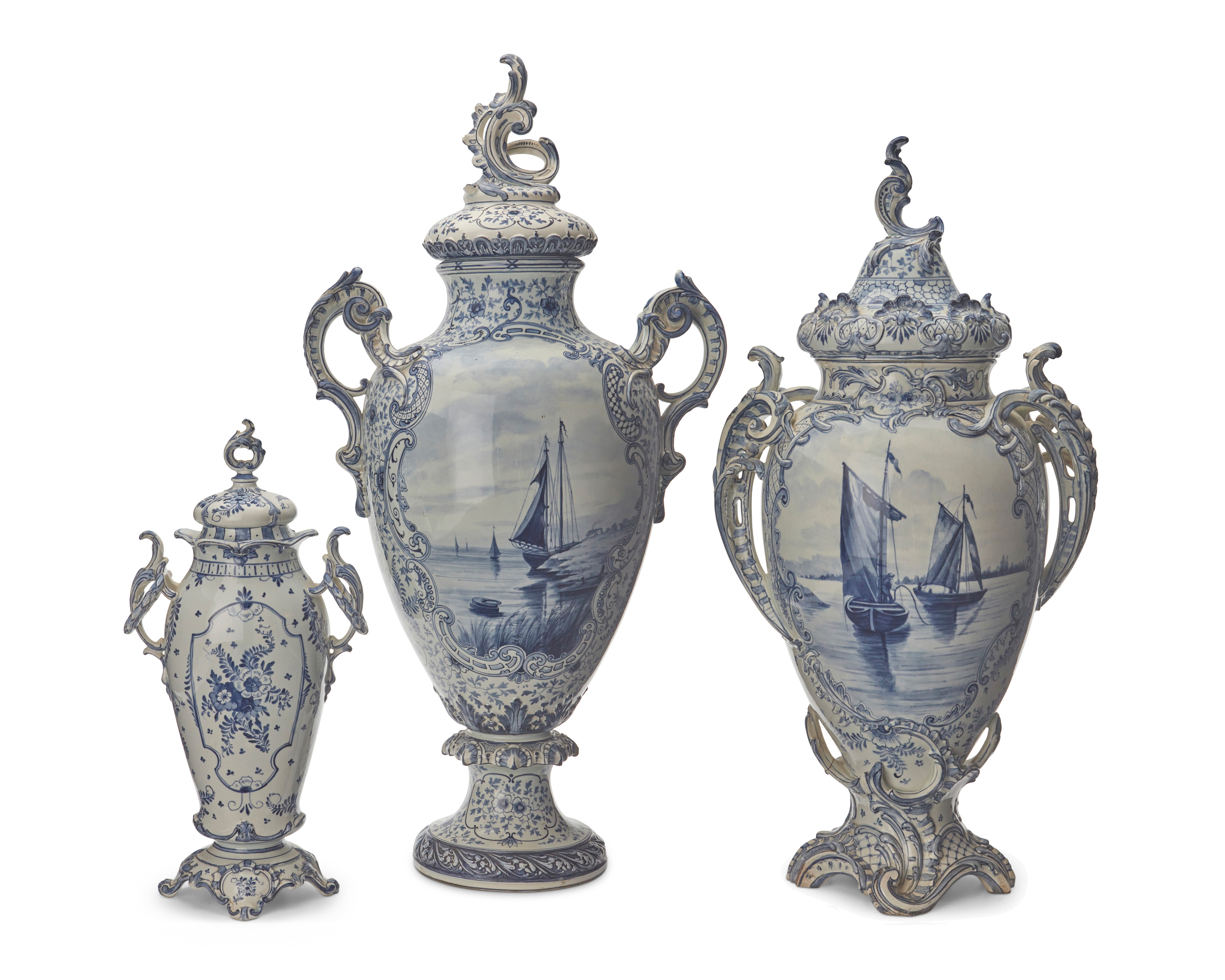 • Lot n° 17 Three Royal Bonn earthenware 'Delft' covered urns Mid/late 19th century Each marked: Royal Bonn / "Delft"; each impressed: Franz Ant. [Anton] Mehlem / Bonn A/Rhein; each with various impressed and painted numbers The handled and lidded urns, each depicting sailboats to one side and floral motifs to the other 3 pieces Tallest: 30.25" H x 15.5" W x 10.75" D; Shortest: 17" H x 8.5" W x 6.5" D One with two 2" long vertical cracks in the rim. The middle with chipped losses to feet/base. Each overall good condition with shelf wear, scattered minor scuffs, and inherent firing flaws commensurate with age. Each with crazing to the glaze. No evidence of restorations or repairs under UV light.