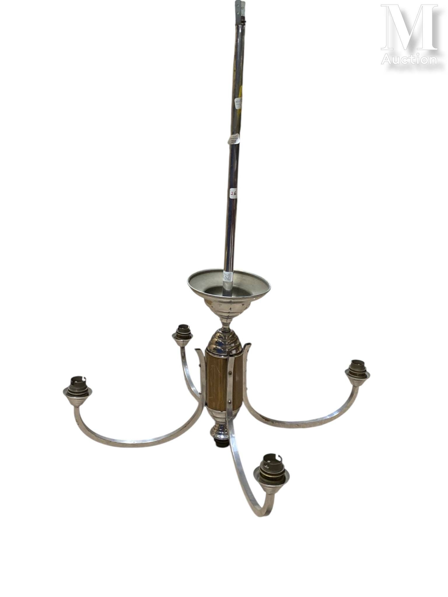 • Lot n° 268 Lustre moderne à quatre bras de lumière en métal chromé, coupes en verre rondes à décor de gouttes blanches. France, circa 1940