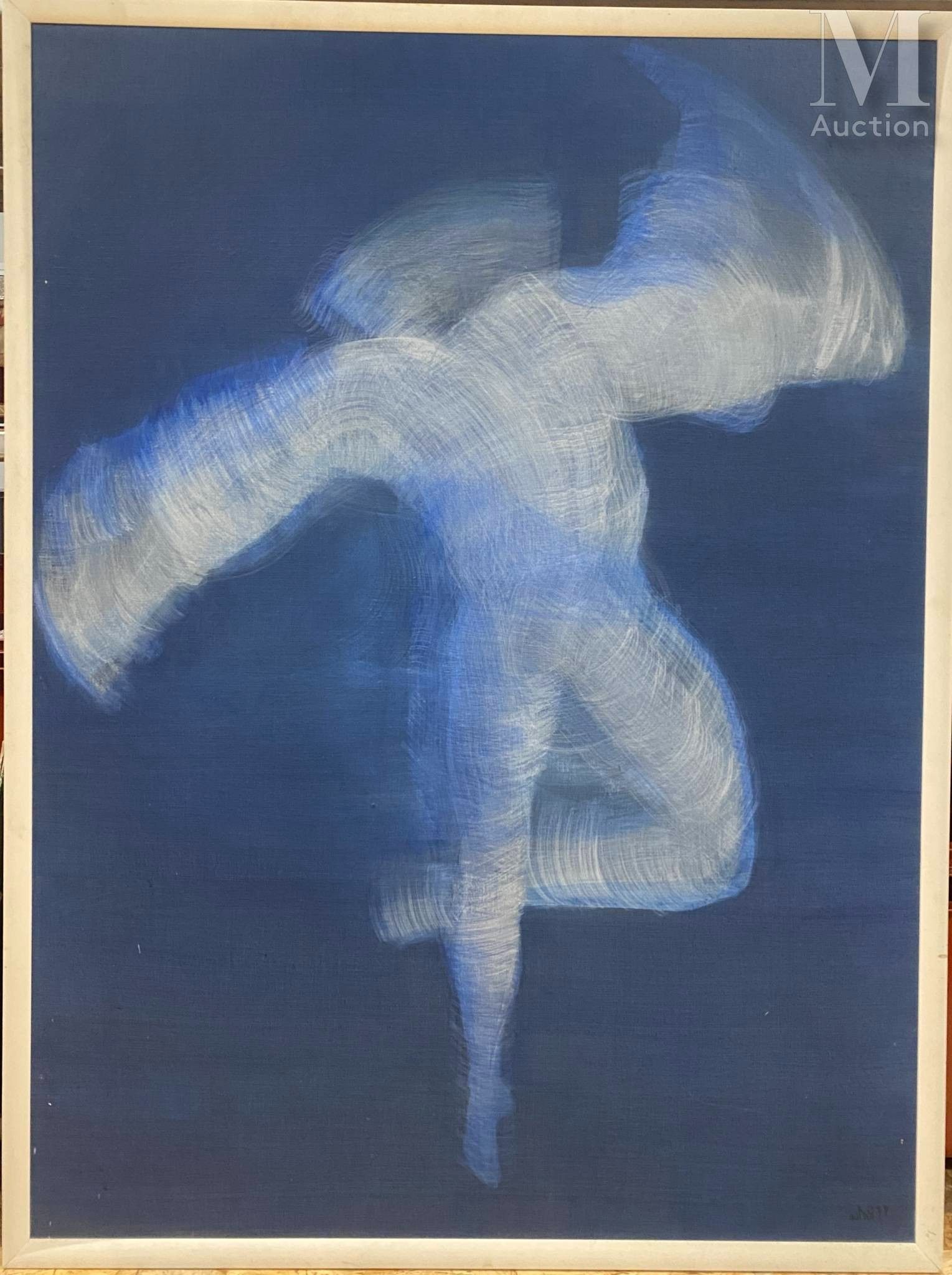 ASTRID (XXe) Personnage blanc en mouvement sur fond bleu Toile Signée et datée en bas à droite 78 Datée au dos "décembre 78" 126 x 95.5 cm.