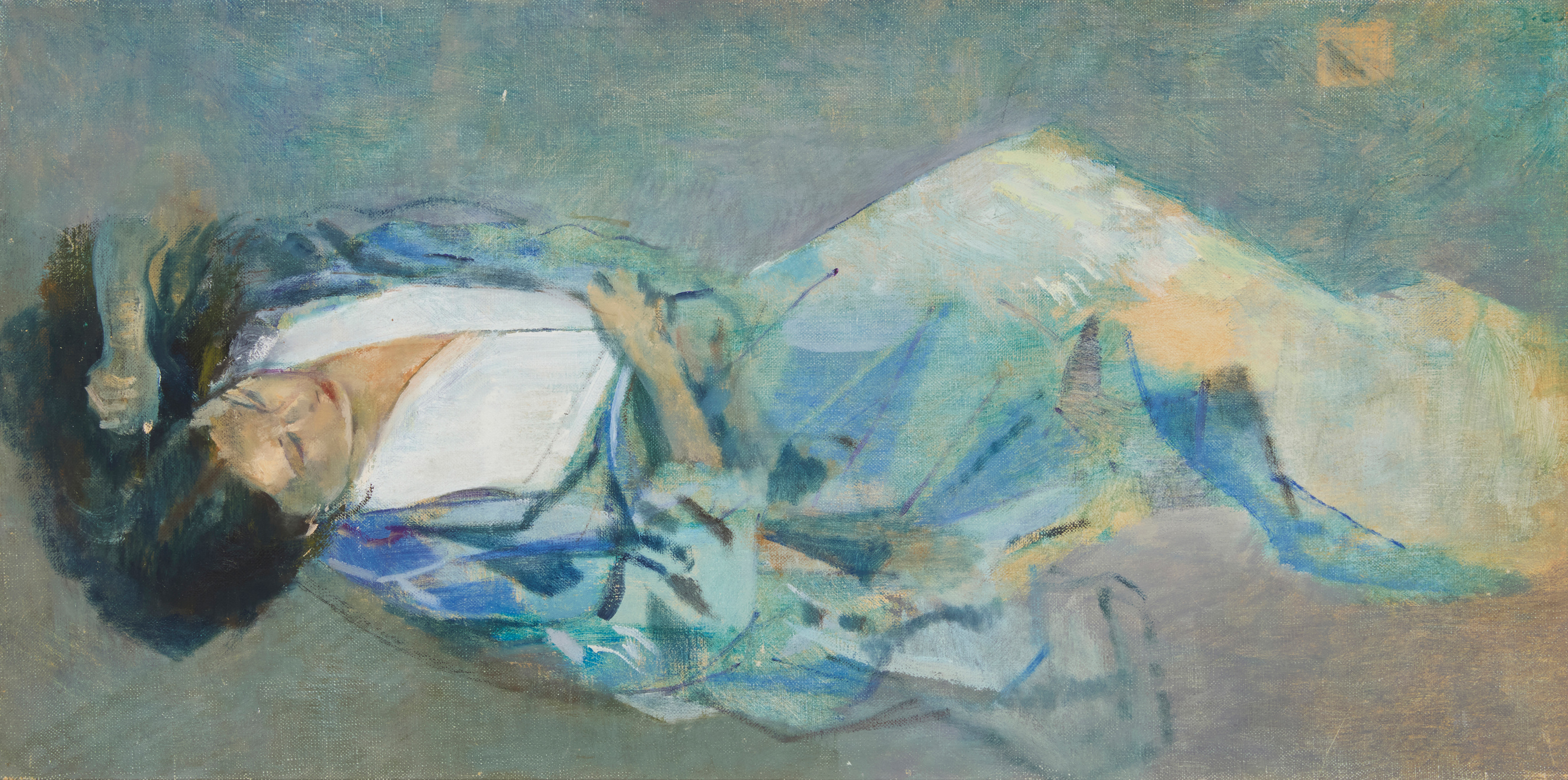 Mario Armond Zamparelli (1921-2012) "Blue Kimono: reclining figure," 1980 Oil on linen Initialed and dated upper right: Z 80; signed again, titled, and dated on a label affixed to the stretcher bar: 1980 13" H x 25.5" H Provenance: The Estate of Mario Armond Zamparelli, La Cañada, CA