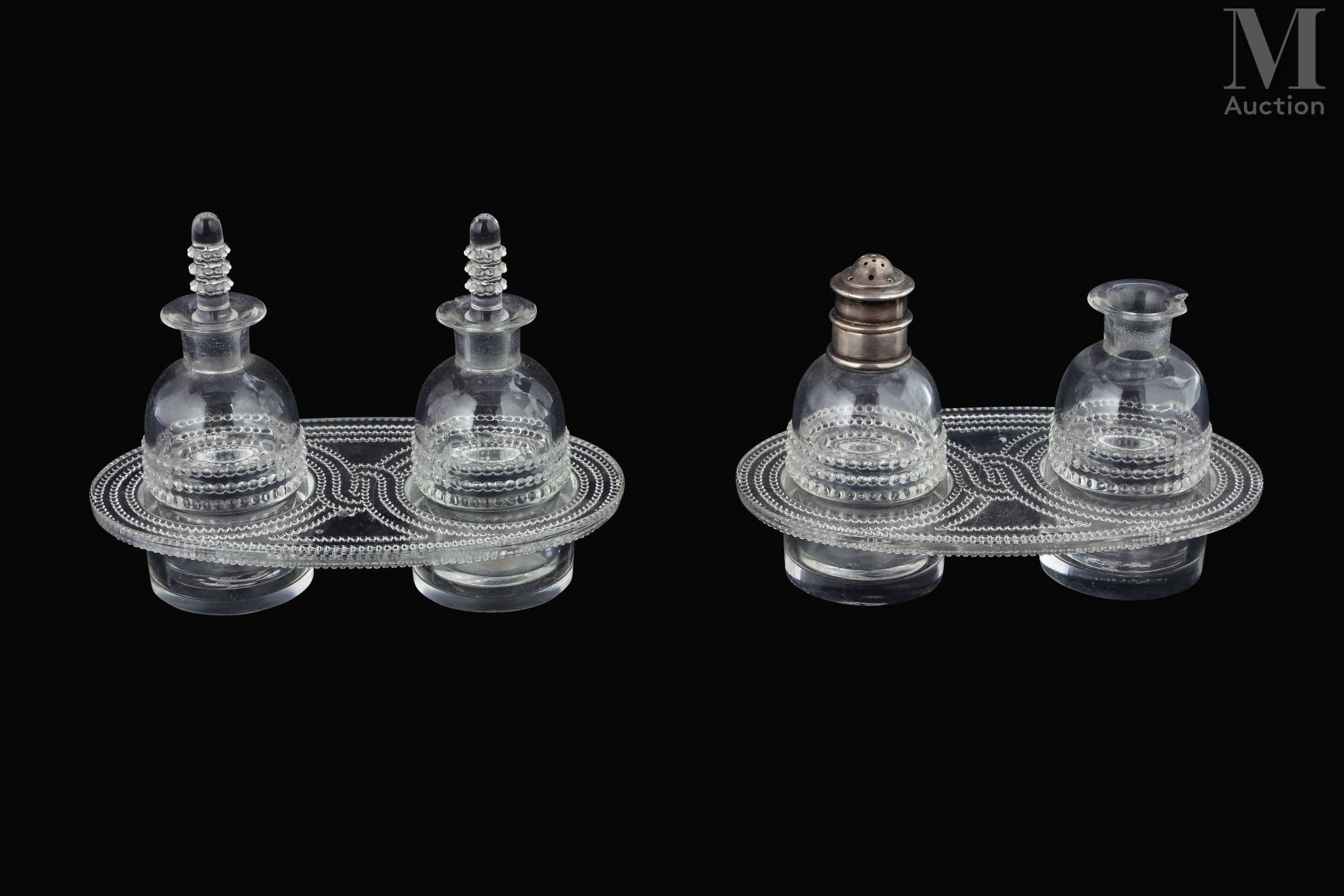 LALIQUE, 2 nécessaires de table à condiment, à décor perlé H: 12 - L: 15,5 - P: 9 cm (accidents)