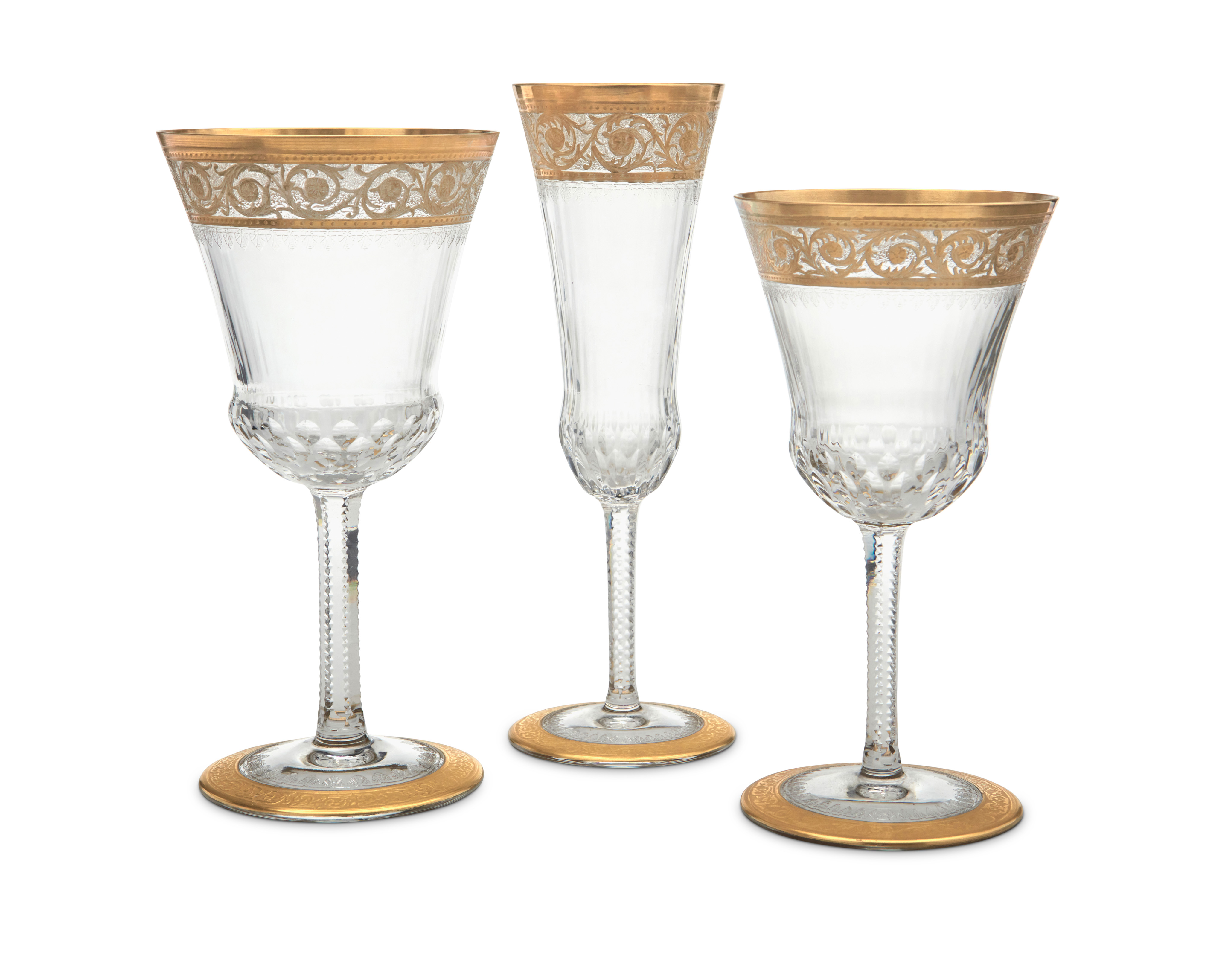 • Lot n° 23 A Saint-Louis glass 'Thistle' stemware service Late 20th/early 21st century Some with factory stencil mark to underside Comprising 23 fluted champagne glasses (7.5"), 12 continental goblets (7"), and 12 burgundy wine glasses (6.375") 47 pieces Each overall good condition with minor shelf wear, minor wear to the gilding, scattered minor scuffs, and light scratches commensurate with age.