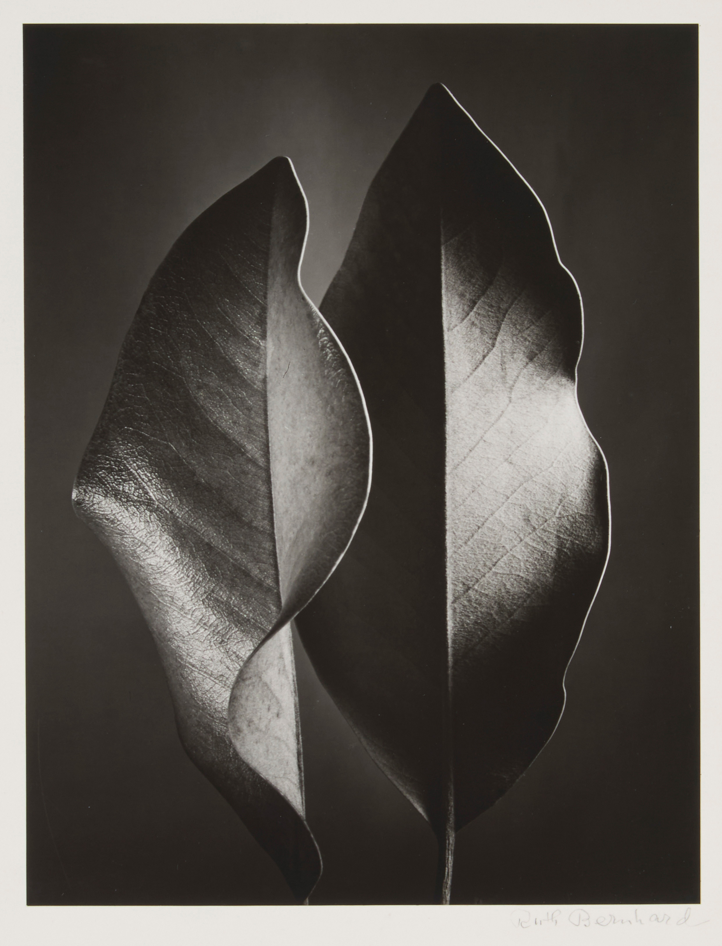 • Lot n° 2055 Ruth Bernhard (1905-2006) "Two Leaves," from "The Gift of the Commonplace" portfolio, 1952 Gelatin silver print on paper mounted to matboard From the edition of unknown size, printed later Signed in pencil along the lower edge of the matboard, at right: Ruth Bernhard Image/Sheet: 9.75" H x 7.5" W; Matboard: 16.875" H x 13.875" W Provenance: Property from a Professional Photographer, San Francisco, CA, acquired directly from the artist Overall good appearance. As mentioned, the sheet is mounted to a matboard. Unframed