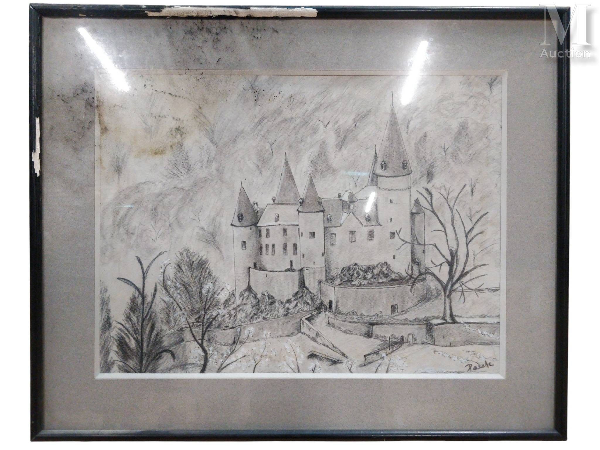 Raymonde Gabrielle Marie Paule de Rivaud de La Raffinière dite Paule de BEAUMONT (1908-1999) Vue de château Dessin Signé Paule en bas à droite 33 x 45 cm, à vue Humidité