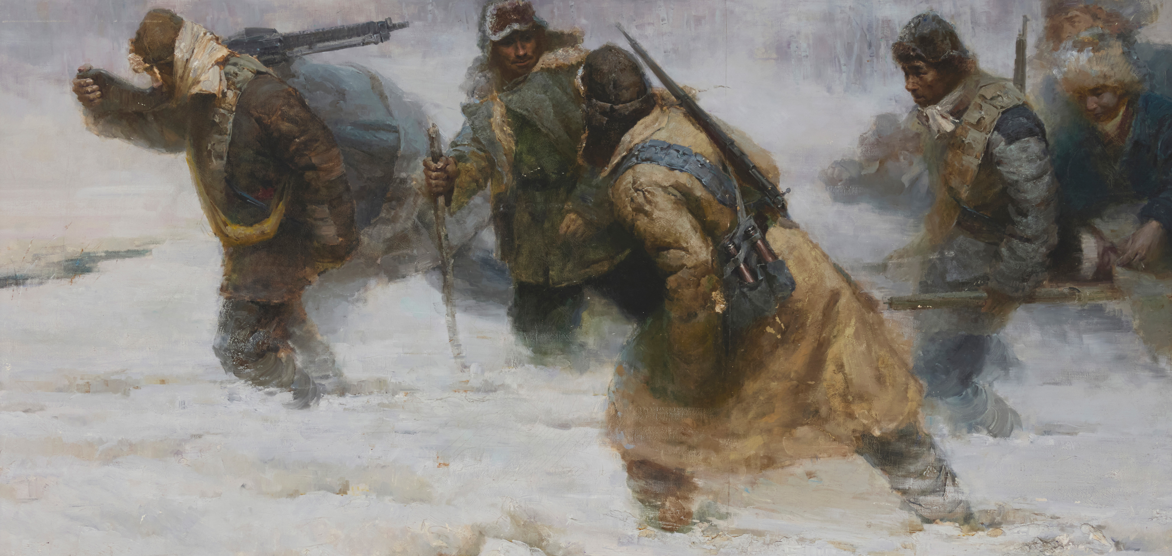 • Lot n° 3031 Zhang Li (b. 1958) "Wind & Snow of Chang Bai Mountain" Oil on joined canvas Unsigned; titled in pencil, in another hand, on a tag strung to the frame's hanging wire 40.5" H x 83" W Other Notes: Zhang Li is another prominent realist painter represented in the Jones Collection. Born in Beijing in 1958, he joined the People's Liberation Army at the age of 18, serving as an officer while also studying painting. He graduated from the Fine Art Department of the People's Liberation Army in 1983. Zhang is well known for his exquisite figurative works, particularly portraiture. His paintings are held in the permanent collection of the Chinese National Gallery, and he has received numerous accolades, including the Artist's Excellence Award in China and the Grand Prize in the American Society of Portrait Artists' International Portrait Competition. The present work is exceptionally rare within the artist's career: a large-scale, multi-figure battle scene depicting the everyday heroics of the Eighth Route Army during an engagement with the Japanese Imperial Army in 1943. The Eighth Route Army, known for operating in remote areas of Northeast China, then largely under Japanese control, was also notable for the number of women in its ranks, as reflected here in the upper right with Zhang's depiction of a female soldier tending to the wounded. Such canvases were vital to the reimagining of contemporary art in China, redirecting realism away from the idealized forms of propaganda and toward the gritty realities of history, realities that, in many cases, proved all the more heroic. Visual: Overall good appearance. Scattered, fine craquelure, primarily in the upper right quadrant. A vertical seam attendant with the joining of two pieces of canvas down the length of the work to the right of center and an area of unstable craquelure in the center of the seam. A soft, scattered 11" vertical surface scuff along the left portion of the upper edge. Blacklight: No evidence of restoration. Frame: 43.25" H x 85.5" W x 2.5" D