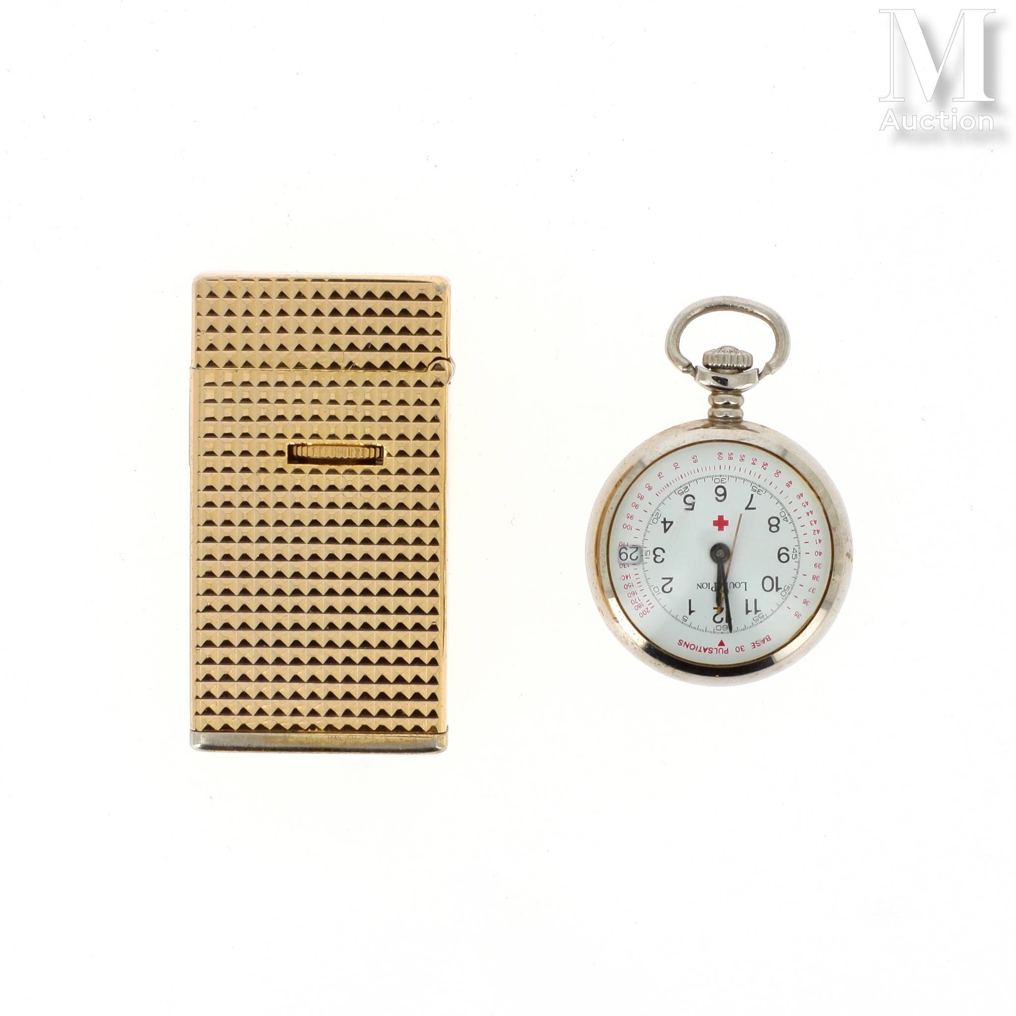 Briquet et montre Lot fantaisie comprenant: - un briquet en métal doré guilloché, signé VENUS (H: 5,5 cm); - une montre de gousset en métal argenté, signée Louis PION; guichet date à 3H (D: 30 mm). En l'état, usures, chocs.
