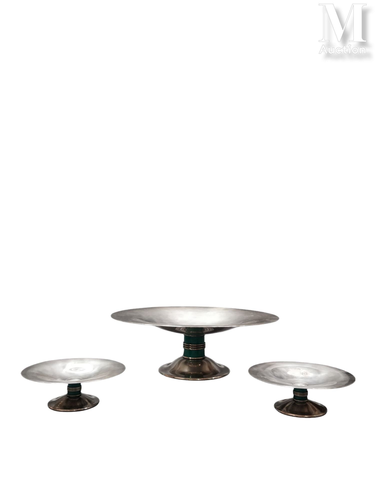 • Lot n° 155 Christofle - Vers 1930 Grande coupe circulaire en métal argenté, reposant sur un fût tubulaire bagués, laqué vert à l'imitation de la malachite. H. : 12 - D. : 35 cm On y joint deux coupes circulaires au modèle H. : 5.5 - D. : 16 cm