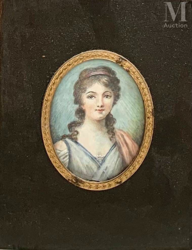 Ecole française du XIXème siècle Elégante au ruban rouge Miniature, huile sur panneau 8,5 x 6,5 cm