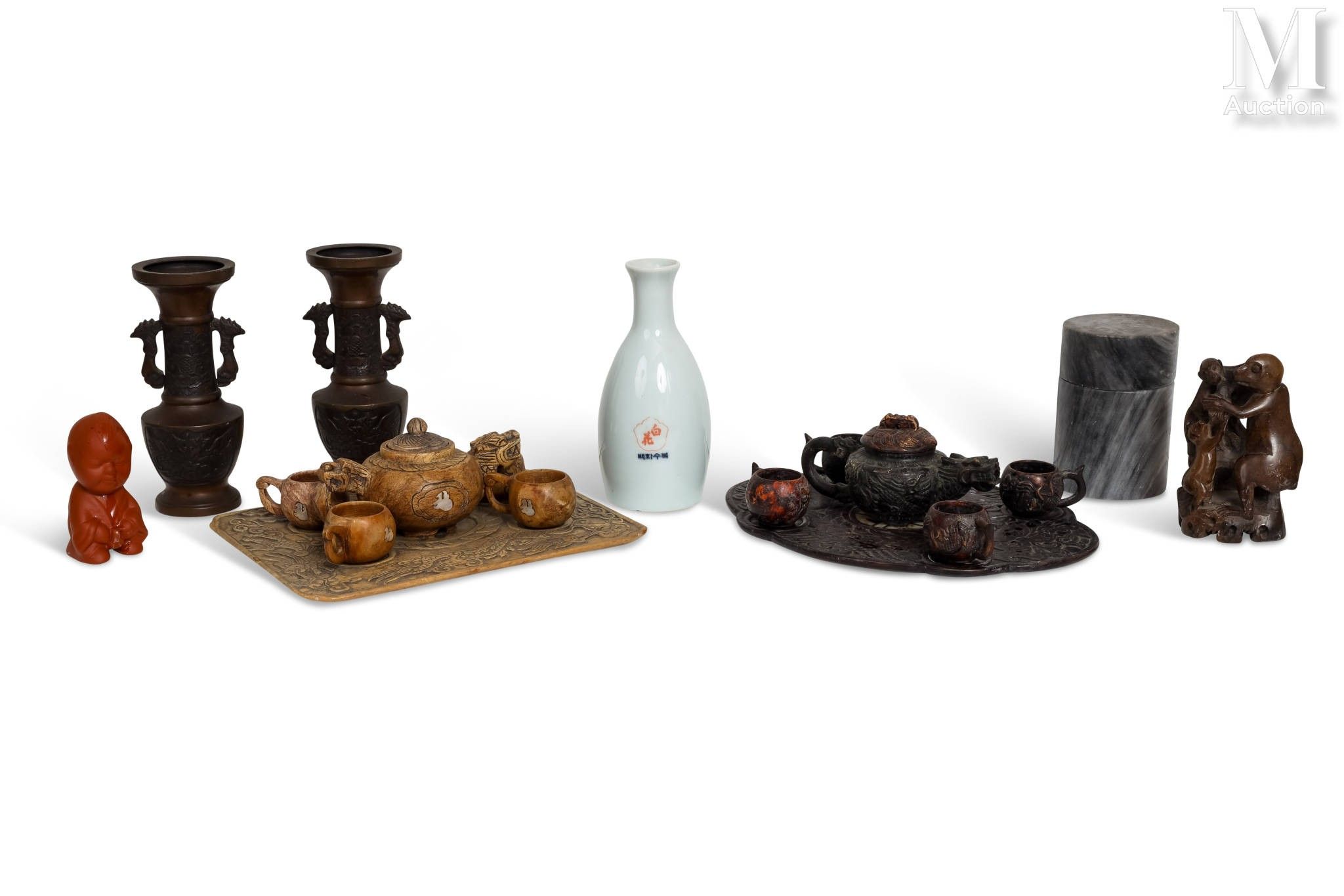 • Lot n° 36 ASIE Lot de souvenirs de voyage Comprenant : deux plateaux à thé miniatures, une bouteille à saké, une boîte cylindrique, une paire de petits vases, un sujet en bois et un personnage en grès. Objets de formats et matériaux variés Vendu en l’état.