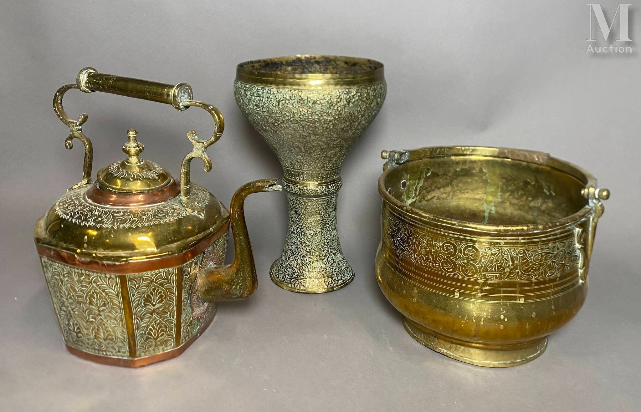 • Lot n° 92 Ensemble en cuivre et laiton comprenant : - Un pot en cuivre. H. 23 cm - Un vase en laiton (sans fond). H. 35.5 cm - Une verseuse, fin XIXe siècle. H. 35 cm Accidents