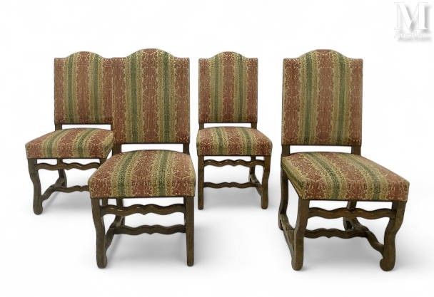 Suite de 4 chaises os de mouton en noyer, à traverse sur le face antérieure, entretoise, les dossiers droits, pieds cambrés. De style. Garniture de velours gaufré. 99 x 45 x 41 cm.