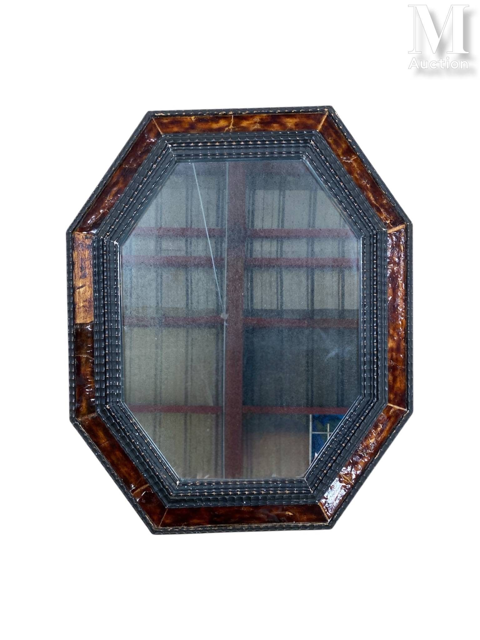 Miroir de style Louis XIV de forme octogonal dans un encadrement en bois teinté noir et marqueterie à imitation d'écaille de tortue. 55 x 45 cm. Accidents, manque usures.
