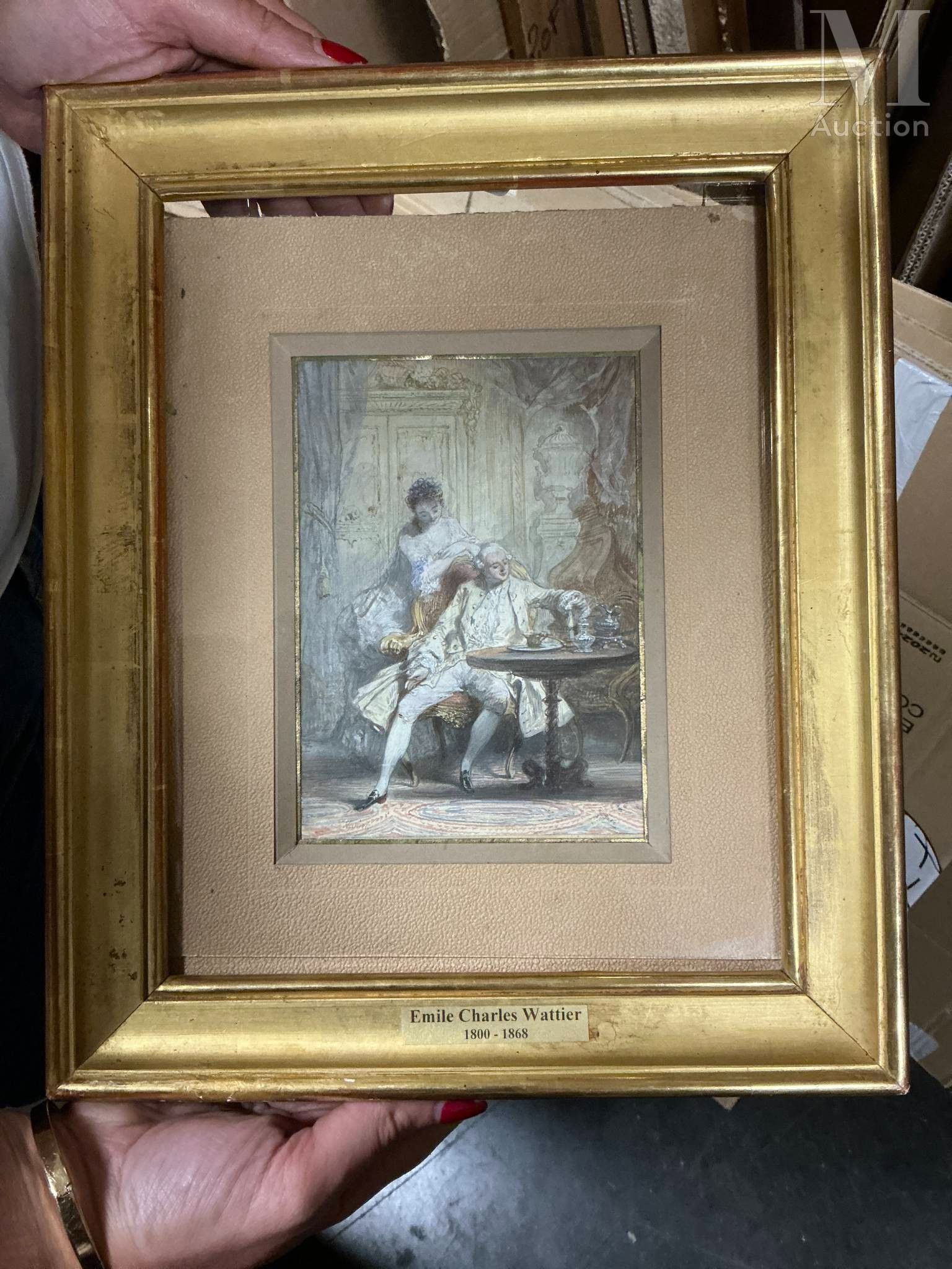 Émile Charles WATTIER (1800-1868) La conversation galante Aquarelle sur papier 17 x 12 cm Signée Wattier en bas à gauche