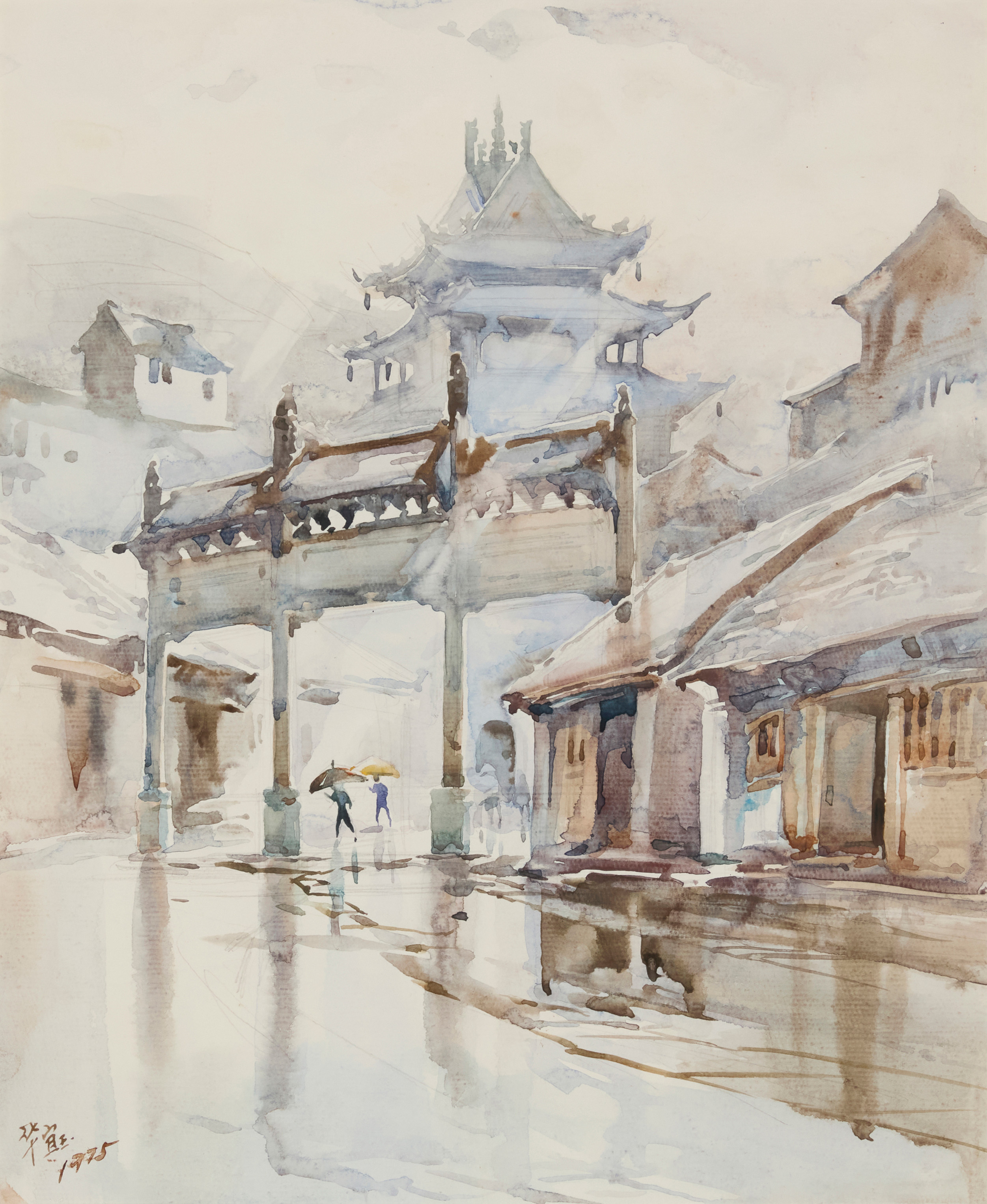 Hua Yiyu (1922-2005) "Xiantong Temple at Wutai Mountain," 1975 Watercolor with traces of graphite on paper Signed in Chinese and dated 1975, lower left; titled by repute Sight: 17.125" H x 14.125" W Other Notes: Hua Yiyu was the oldest artist in the collection. Born in 1922 into an official family in Beijing, she began training in calligraphy and ink painting at the age of six and eventually graduated from what was then the Beijing Fine Arts School's Oil Painting Department. Political and personal circumstances made it difficult for Hua to maintain her painting career for many years, though in the 1950s she sometimes painted while taking her six children to the countryside. It was during this period that she began to focus on architecture, despite discouragement from friends and colleagues, asserting that architecture was an essential element of everyday life and Chinese history. She seldom painted for many years until 1979, when she was invited to contribute to an exhibition that would travel to the countryside. From then on, in her 60s and into her 70s, she returned to her preferred subject matter in exquisite, elegantly executed watercolors. These works are intimate in scale, suggesting the practical aspects of observing architecture and landscape in situ, and perhaps also reflecting her enduring hesitancy as an artist, having been told for years that her works might go unrecognized. Hua's works are now held in the permanent collection of the China National Art Gallery. She served as a professor and lecturer at institutions including the Architecture Department of Beijing University, the Architecture Department of Tsinghua University, and the Architecture Department of Central China Technical University. She was a member of the China National Art Association, the Beijing Watercolor Painting Association, and numerous other professional associations. Her students were many and her influence extensive, including Liu Fenglan, also prominent in the collection. Overall good appearance. Not examined out of the frame. Framed under glass: 24.5" H x 21.5" W x 1.125" D