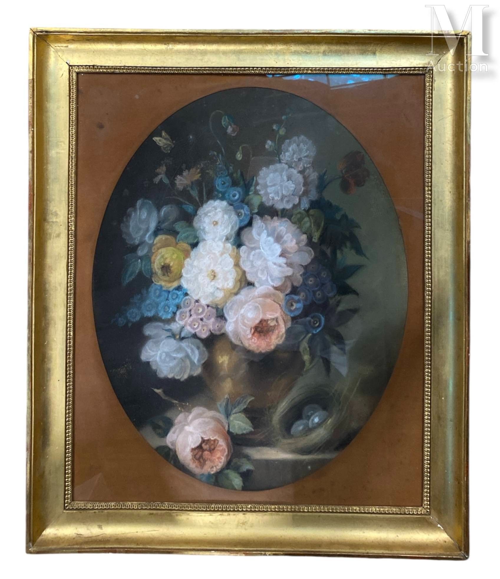 École FRANÇAISE du XIXème siècle Nature morte au bouqet de fleurs et au nid d'oiseau Pastel, vue ovale. 53.5 x 41 cm, à vue.