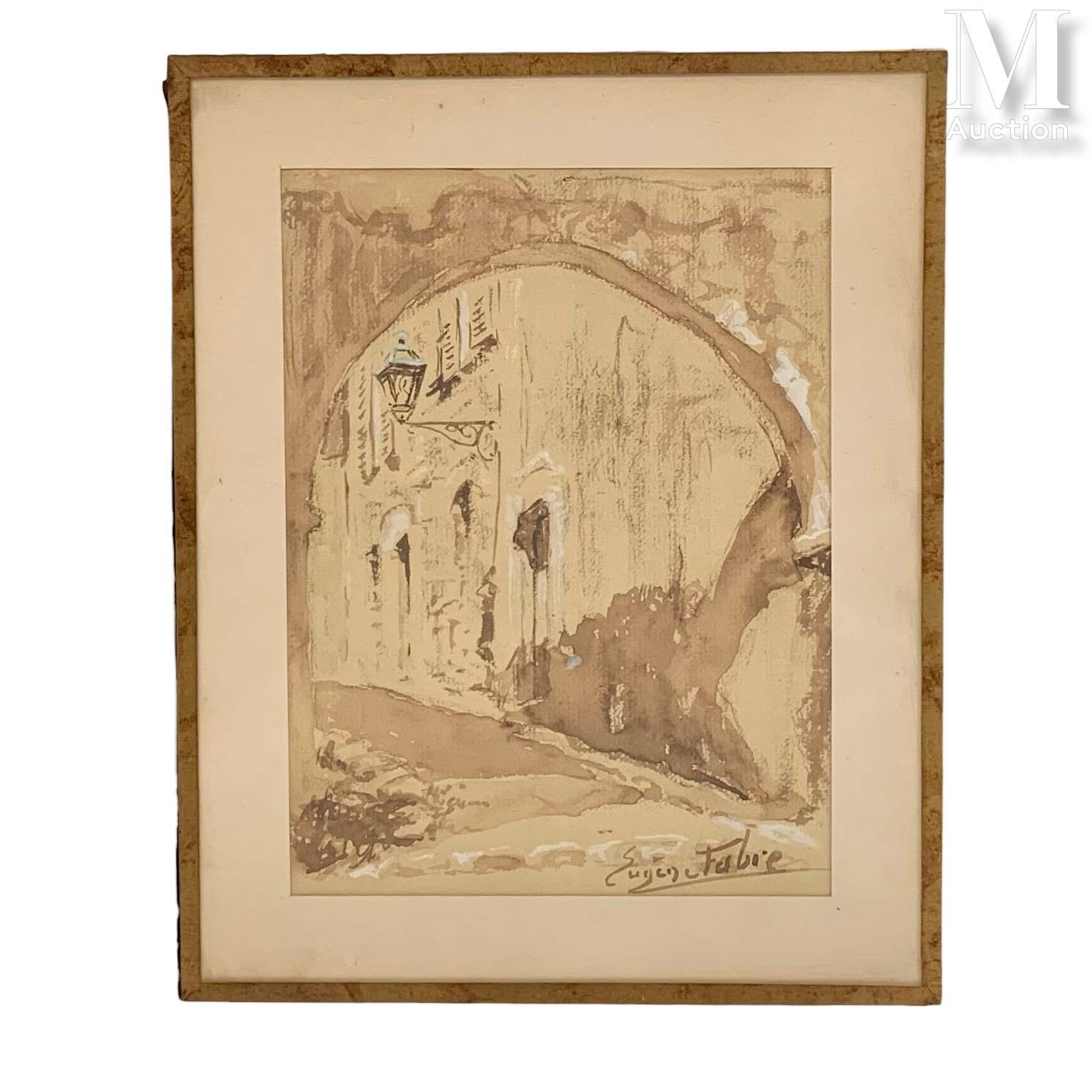 Louis Eugène Fabre (Actif au XXème siècle) Vue de ruelle Lavis, encre et gouache sur papier, signée en bas à droite 20,5 x 15 cm