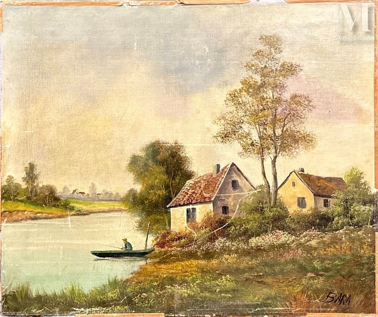 BARA Peche aux abords de la ferme Huile sur toile, signée en bas à droite 46 x 55 cm