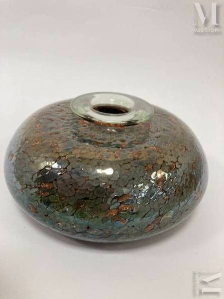 Jean-Claude NOVARRO (1943-2015) Vase à panse aplati et col resserré évasé en verre à inclusions verte nuancé et partiellement doré. Signé Novarro". H : 9 cm Diam : 19,5 cm