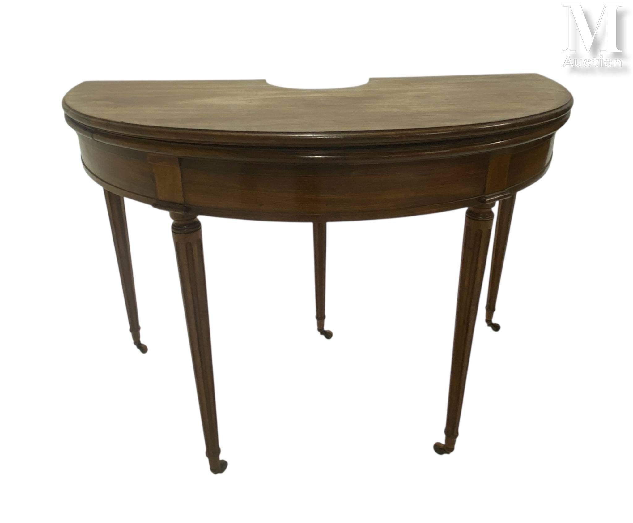 • Lot n° 160 Table à jeu bouillotte demi-lune reposant sur 5 pieds fuselés cannelés terminés par des roulettes H. 113 Diam ouvert 107,5 cm Insolé, intérieur en feutre vert
