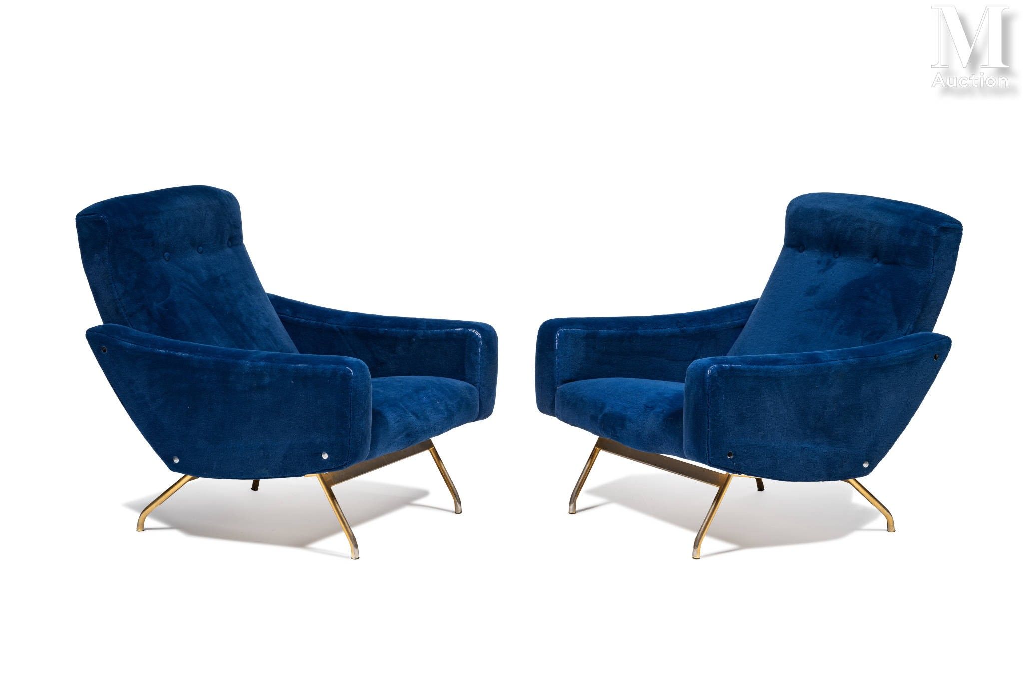 • Lot n° 213 Joseph - André MOTTE (1925 - 2013) & STEINER Editeur Editions Steiner Paire de fauteuils à structures en bois recouvertes de velours bleu (refait à neuf) Piètement en laiton doré. Plaquettes métalliques de l'éditeurs sous les assises. 88 x 80 x 80 cm (usures et traces d'oxydation) A pair of blue velvet covered wood and gilded brass armchairs from a Steiner edition of the design created by Joseph - André Motte. Velvet has been refurbished. Editor's metal tag under the seats. 34,65 x 31,50 x 31,50 inch (wears and oxydization traces)