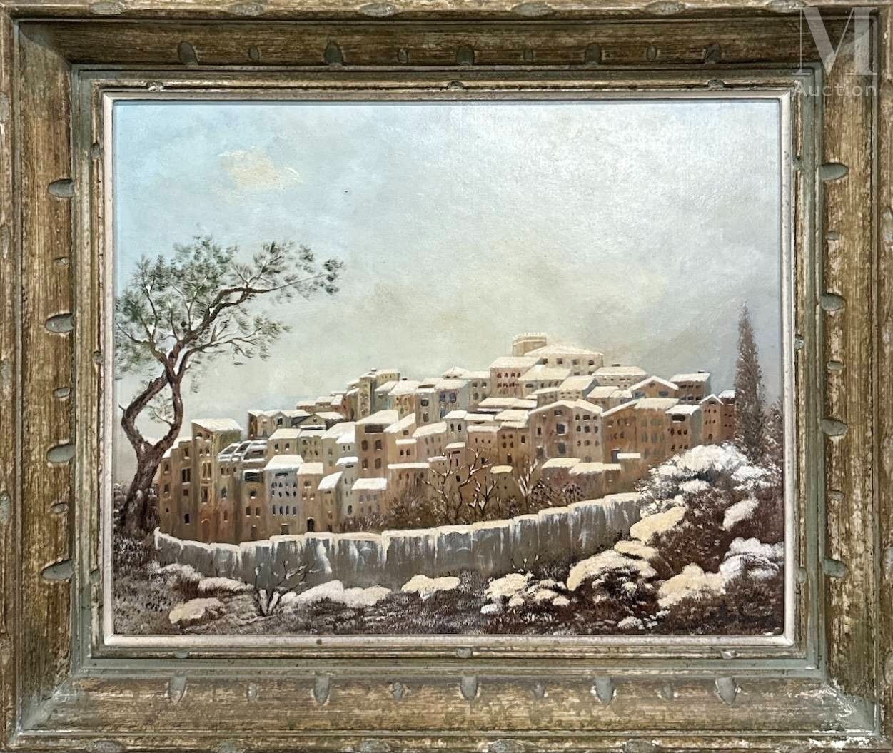 Le SCOUR (Actif au XXème siècle) Tourrettes sur loup hiver 1985 Huile sur isoler, signée en bas à droite, contresignée, datée et titrée au dos 33 x 40 cm