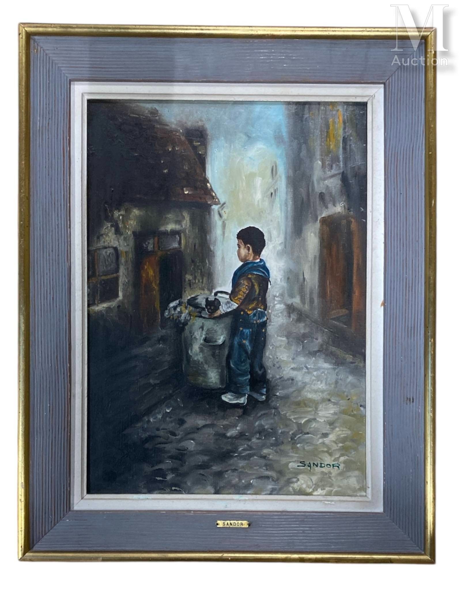 L. SANDOR (XX) Enfant dans une ruelle récupérant un chat dans une poubelle Huile sur toile Signé en bas à droite 45 x 32 cm