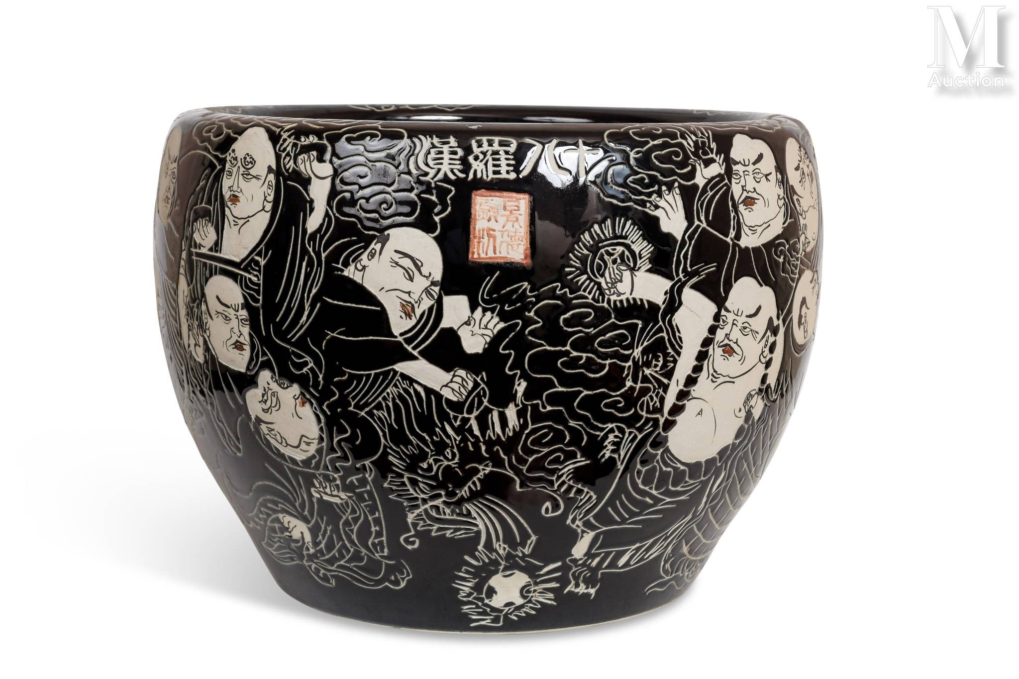 CHINE, travail moderne Cache pot en céramique à décor gravé de dix huit Lohan et des inscriptions Hauteur : 32 cm Diamètre : 42 cm