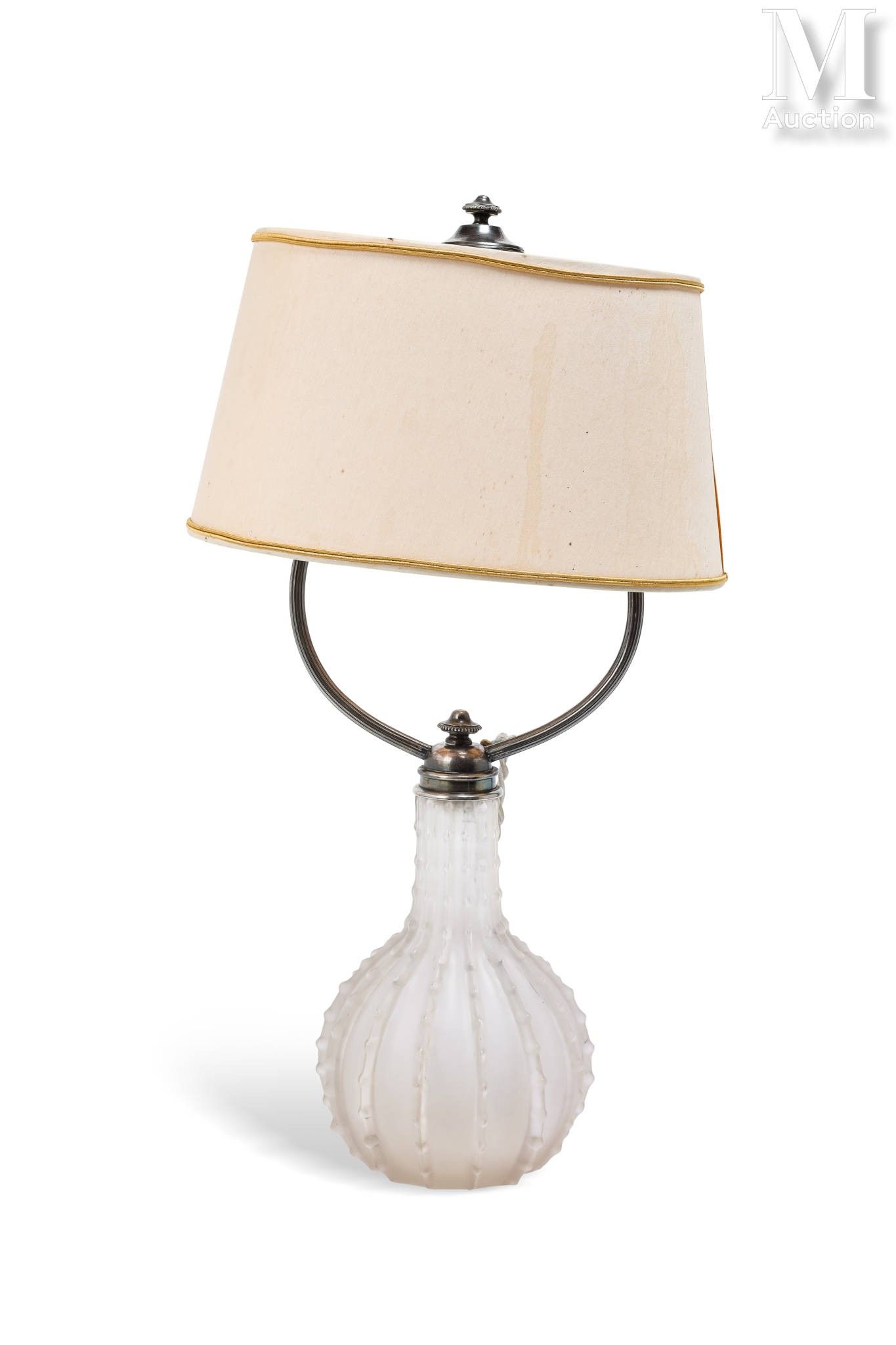 • Lot n° 183 René Jules LALIQUE (1860 - 1945) "Dentelé" Modèle créé en 1912, non repris après 1947 Vase en verre moulé-pressé satiné monté en lampe par une monture en métal argenté. Signé "Lalique" sous la base. Abat-jour en tissus. H : 19 cm (vase) H : 45 cm (avec abat-jour) A "Dentelé" silky molded-pressed glass vase designed by René Jules Lalique in 1912 (stopped after 1947). It is mounted as a lamp with a silver plated metal frame and a fabric lampshade. Signed "Lalique" under the base. H vase : 7,48 inch H wih lampshade : 17,72 inch