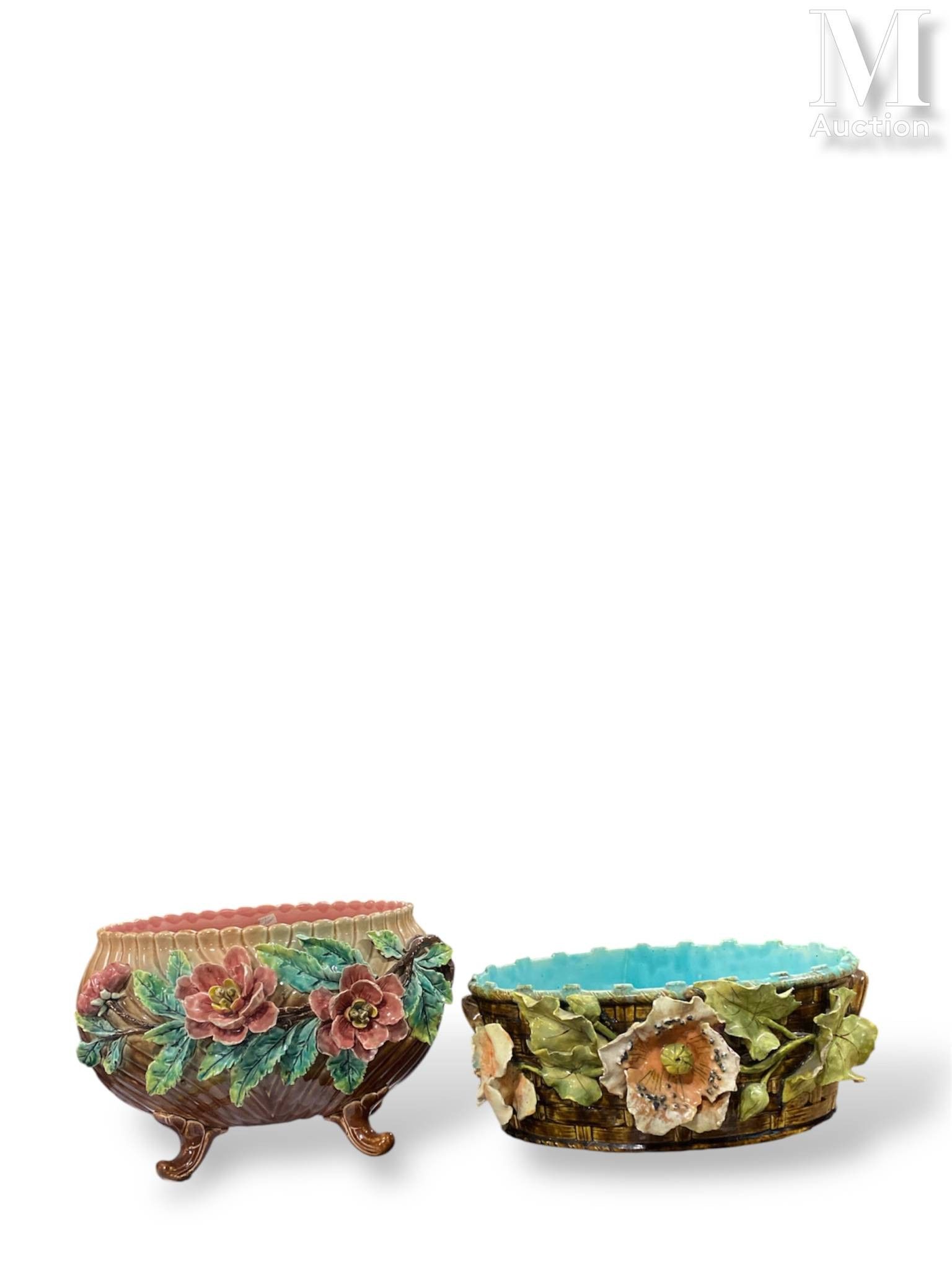 en barbotine polychrome de forme ovale, l'une à fond plat, la seconde sur quatre pieds volutes, à décor en relief de fleurs naturels.