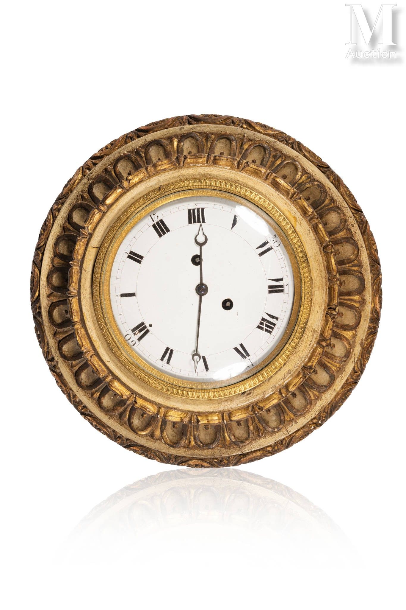 Le cadran émaillé blanc à chiffres romains et arabes, inscrit dans un épais encadrement rond en bois mouluré, peint, doré et sculpté de tores de feuillage, cannelures rudentées feuilles d’acanthe et rosaces.