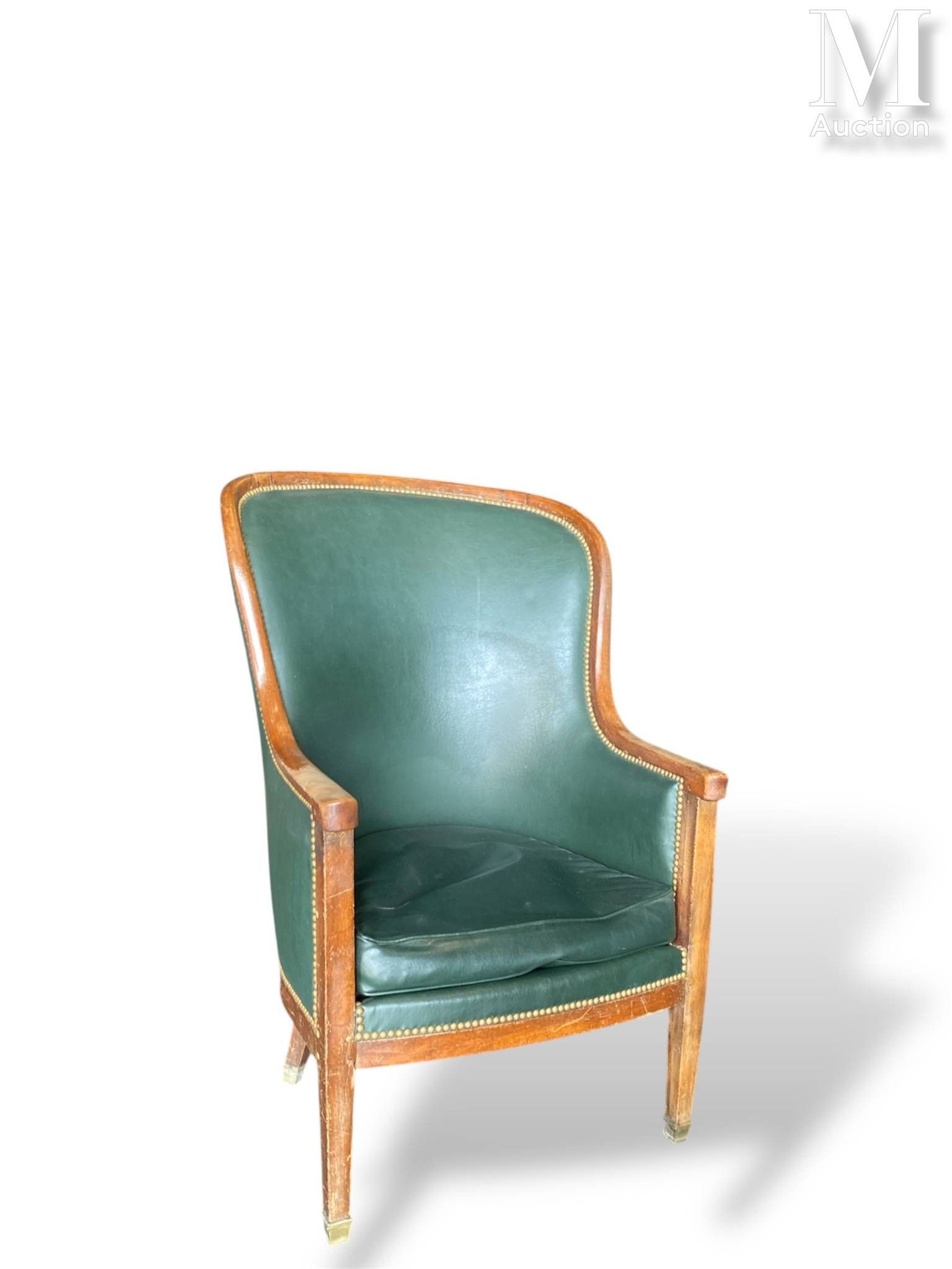 • Lot n° 300 Grande bergère rustique en bois naturel garni d'un cuir vert H. 111 - L. 51 - P. 65 cm. Usures.