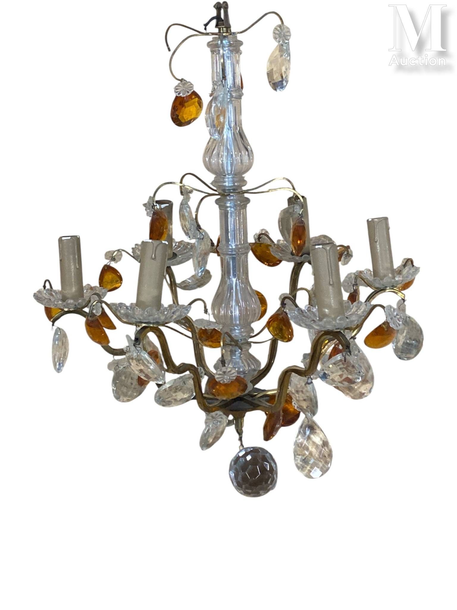 • Lot n° 267 Lustre à pendeloques incolore et orange à six bras de lumière. H. 50 - L. 43 cm. Accidents, manques ; des éléments à refixer.