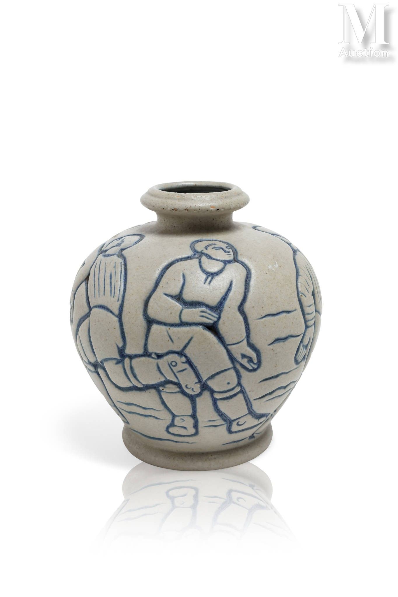 • Lot n° 200 MOUGIN - Nancy Vase en céramique de forme ovoïde à petit col ourlé et décor en léger relief d'une frise couvrante de footballeurs en action à couverte émaillée bleue et beige. Signé "Mougin Nancy", "Legrand. dc" et numéroté "285. J" en creux, sous la base. H : 19 cm, DL : 16 cm A blue and beige enamelled ceramic vae from Mougin – Nancy with a decor of footballers. Signed "Mougin Nancy", "Legrand. dc" and n° "285. J" under the base. H : 7,48 inch, DL : 6,30 inch