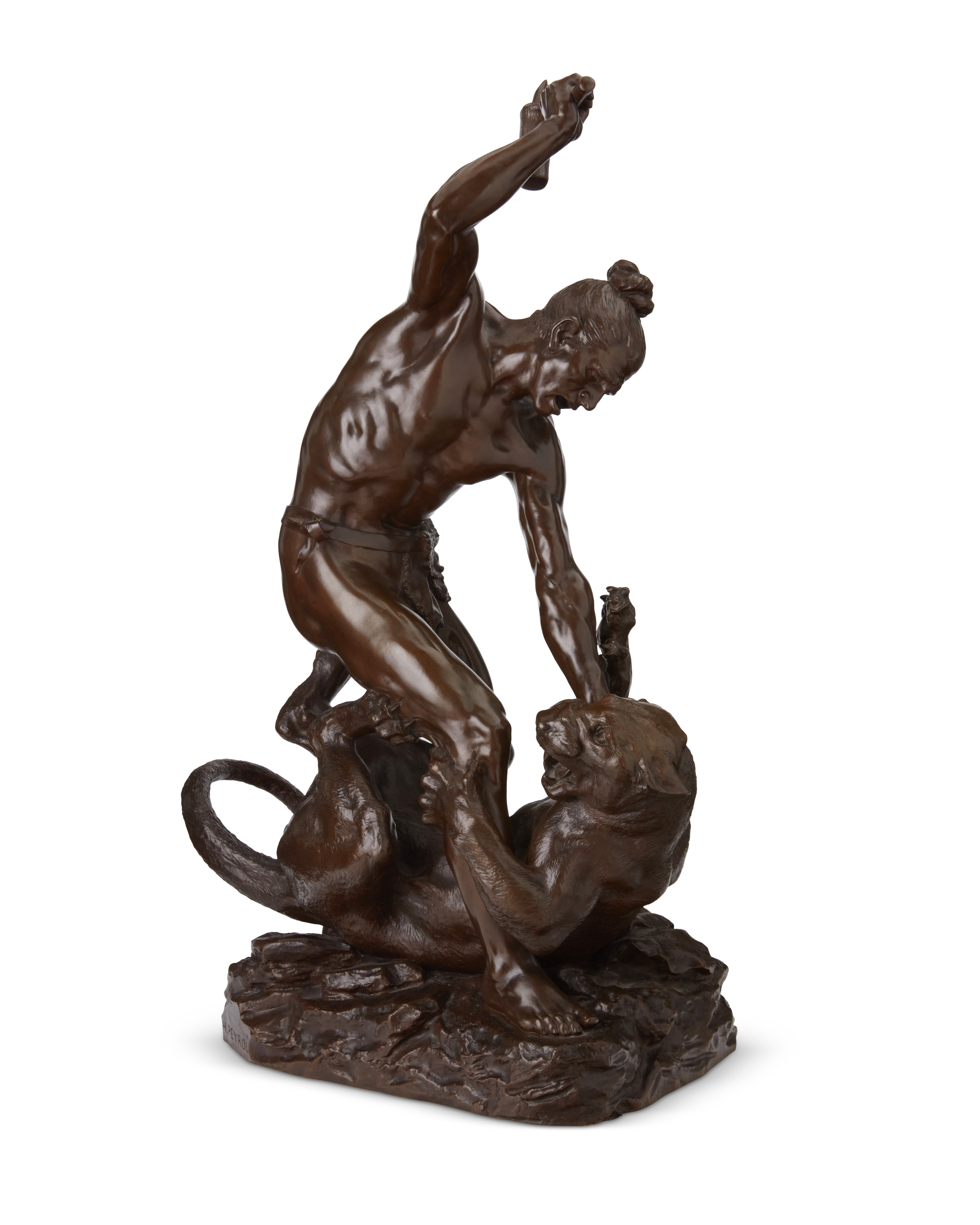 After François Auguste-Hippolyte Peyrol (1856-1929) "L'homme vainquant la lionne" (Man fighting a cougar) Patinated bronze Signed in the casting: H. PEYROL 29.75" H x 17.5" W x 9.75" D Overall good condition with scattered minor scuffs and darkening/oxidation to bronze commensurate with age.