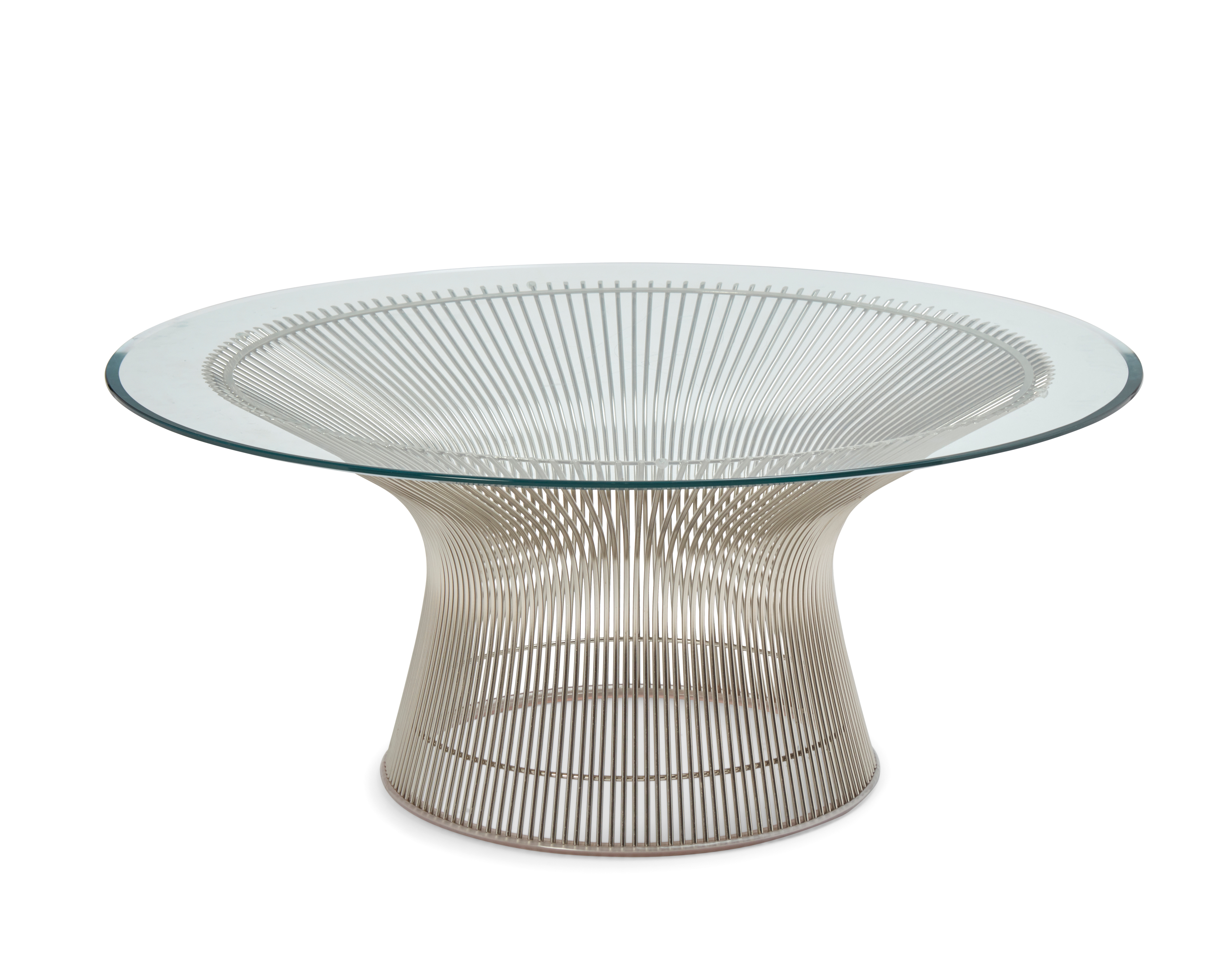 Warren Platner (1919-2006) A coffee table for Knoll, late 20th/early 21st century Designed 1966 The flared steel wire base surmounted by a circular beveled glass top Base: 15" H x 29.75" Dia.; Glass: 36" Dia. Other Notes: Known primarily for his iconic 1960s modernist contribution to the Knoll furniture collection, Warren Platner (1919-2006) would find his way into the world of interior design by way of architecture. Born in Baltimore and graduating from Cornell University, he went on to work under I.M. Pei, Eero Saarinen, and Kevin Roche, where he designed the interior of the Ford Foundation headquarters to critical acclaim. Later projects include the Georg Jensen Design Center (1968), the Water Tower Place mall in Chicago (1976), the interior of the Windows on the World restaurant in New York (1976), and a later renovation of the Pan Am building (1986). The furniture he designed for Knoll, however, would be his most enduring entry into the canon of modern design. Recognized for their sleek and simple silhouettes, his pieces embody a quiet exuberance, both aesthetically versatile and an engineering feat of functional comfort. Released in 1966, his nickel-plated steel wire designs forced Knoll to change the ways they did their welding. Today, they live on as true modernist classics that work seamlessly in almost any interior.
