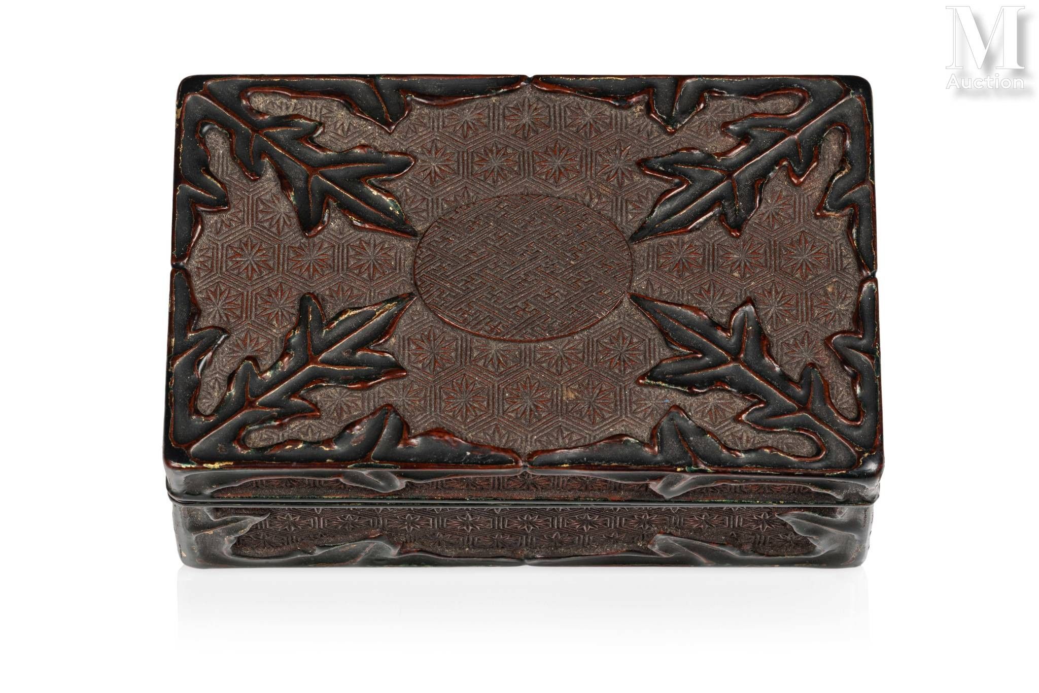 • Lot n° 245 JAPON, XIXe siècle Boîte en laque De forme rectangulaire couverte en bois laqué vert nuancé et rouge, à décor de feuilles sur chaque coins, le fond tapissé de motifs alvéolés fleuris. Longueur : 8,5 cm Largeur : 5,5 cm Profondeur : 3 cm