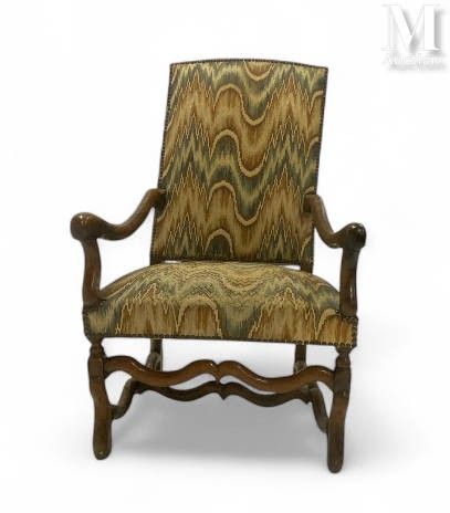 Fauteuil os de mouton en noyer, garniture tapisserie mécanique, bras crosse. 114 x 65,5 x 52,5 cm.
